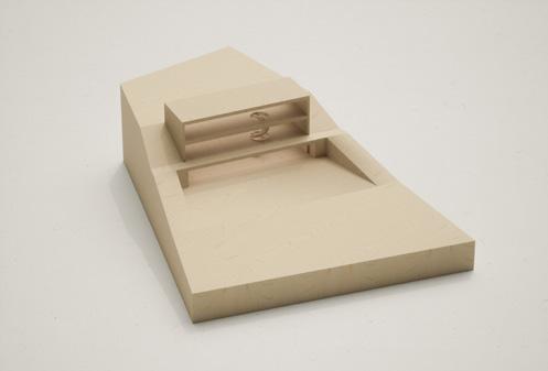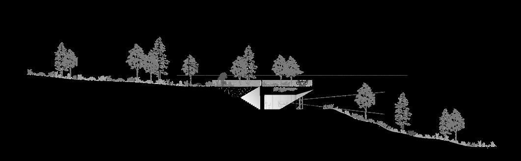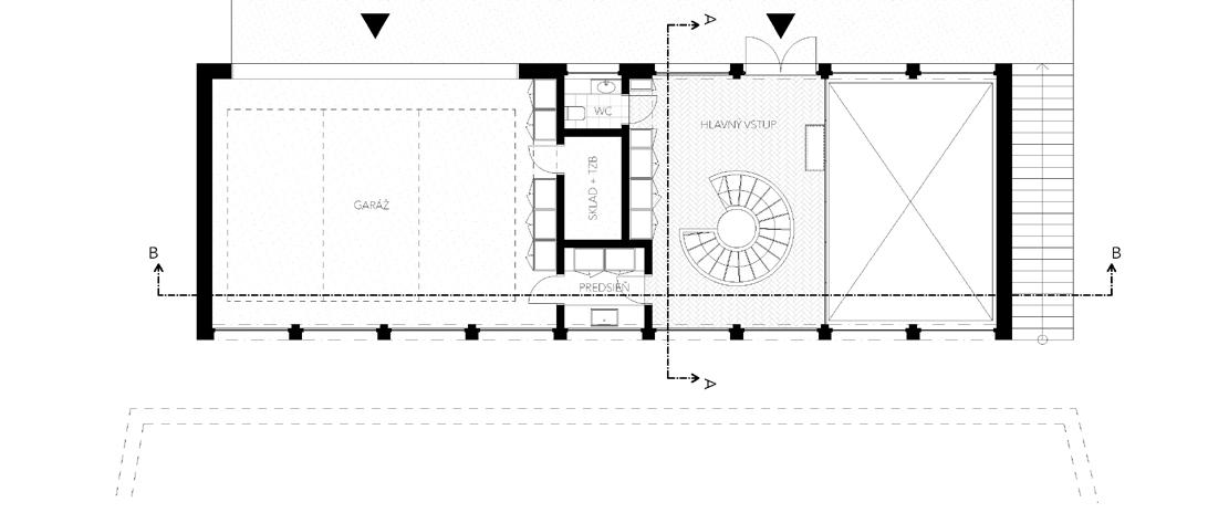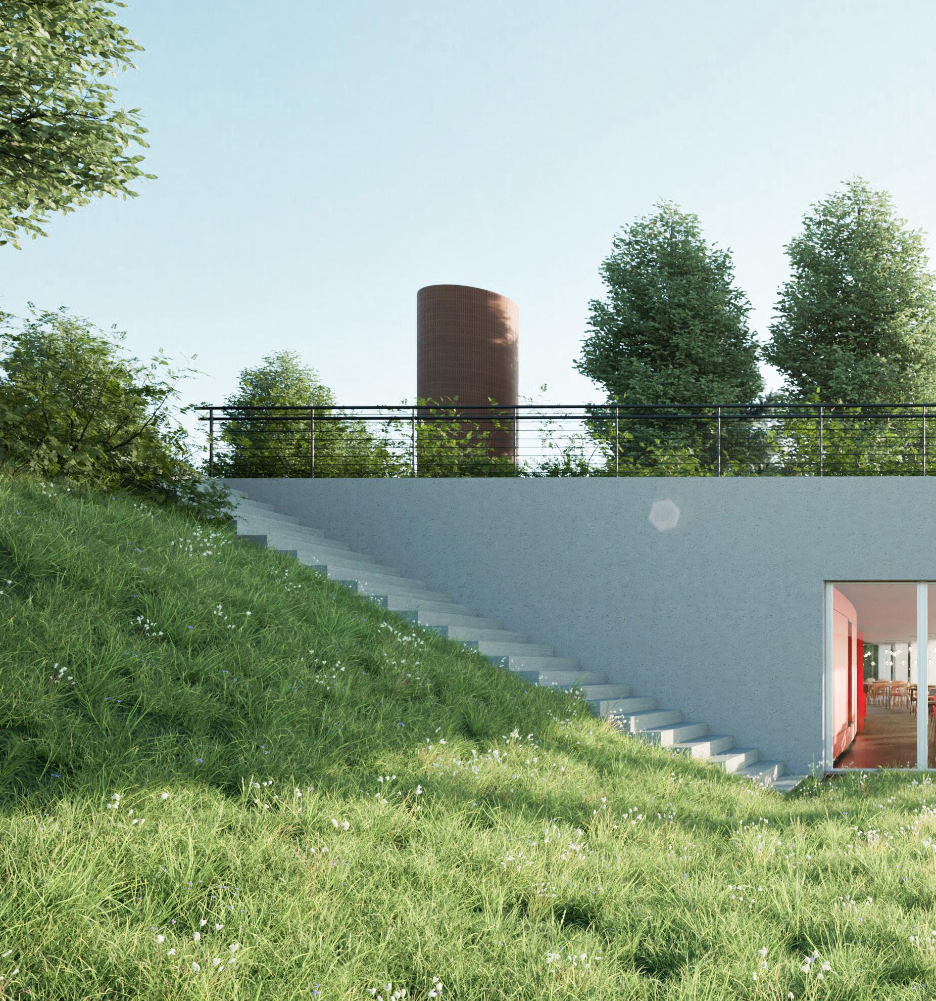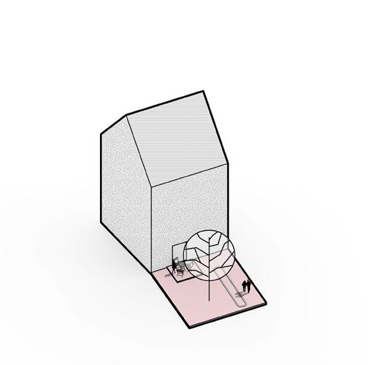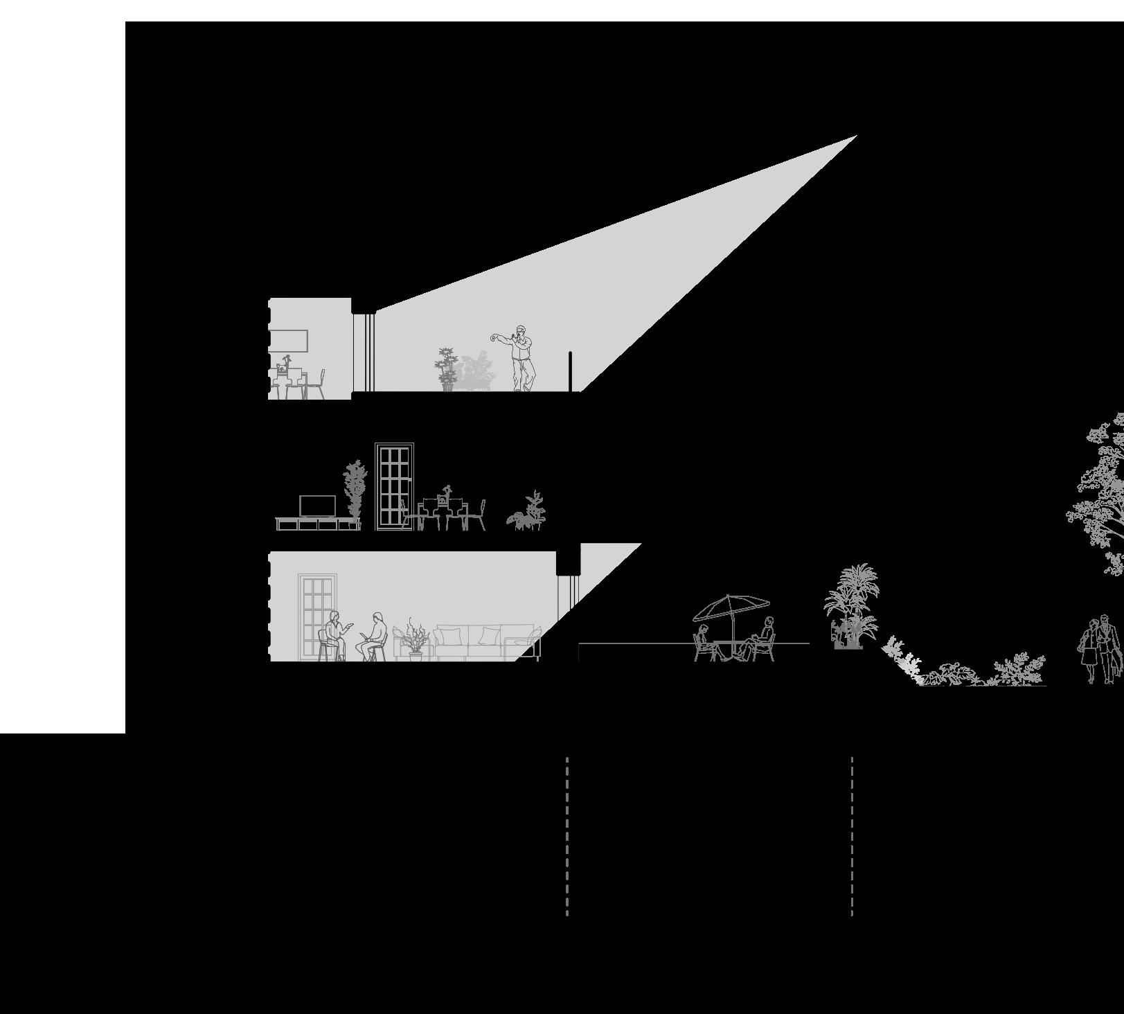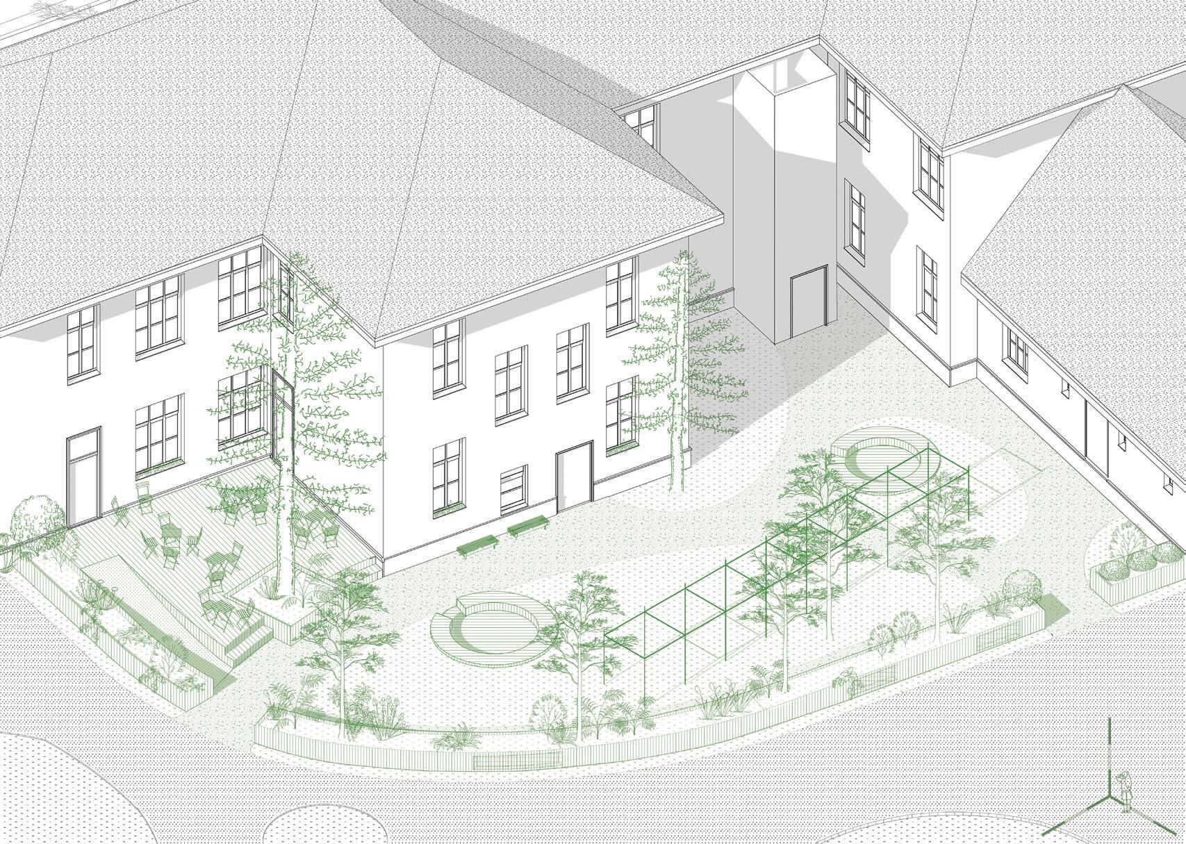 Výškový rozdiel vyrovnávajúci sa pri hranici trojpodlažnej hmoty vytvára dve záhrady (severnú a južnú) s rôznymi funkciami.