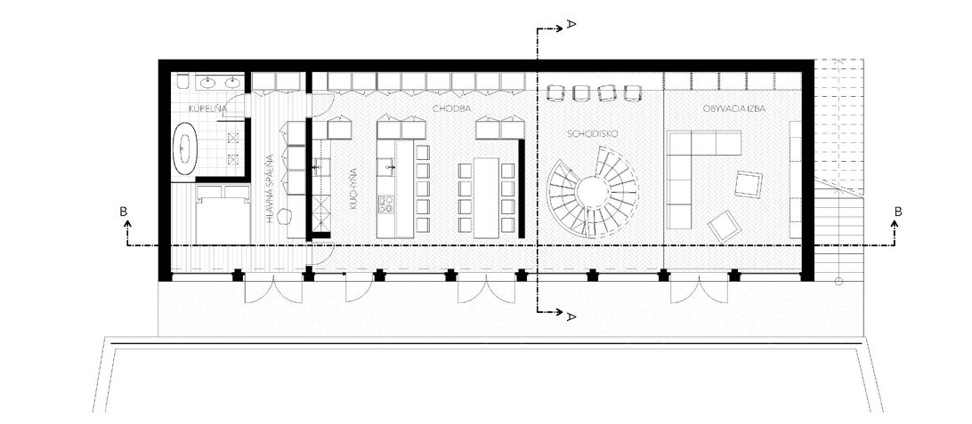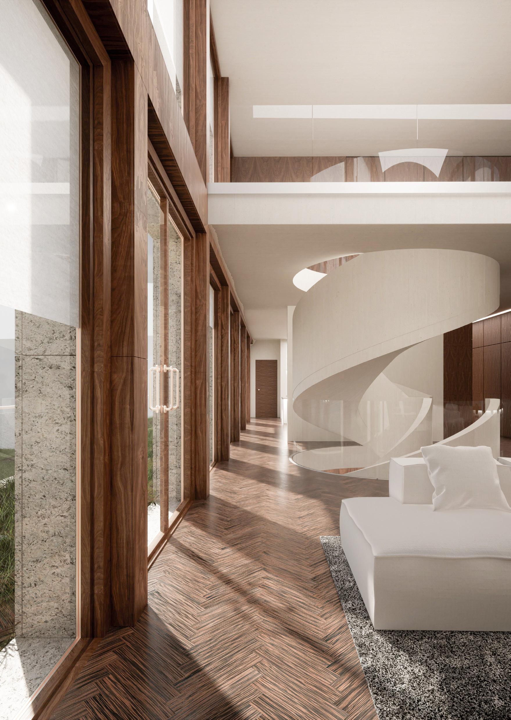 Vertikálne prepojenie dispozície v jednom bode kontinuálne prepája všetky obytné priestory kruhovým schodiskom.
