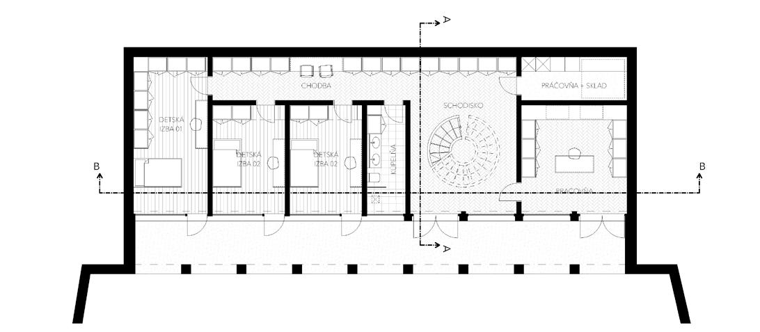 2. NP | Na druhé podlažie vedie ľahké schodisko s pridruženou šmyklávkou. Stred kružnice tvorí pobytová sieť, ktorá nahrádza stredové zábradlie proti prepadnutiu. Pobytové schodisko sa otvára do vonkajšiej strany kružnice.