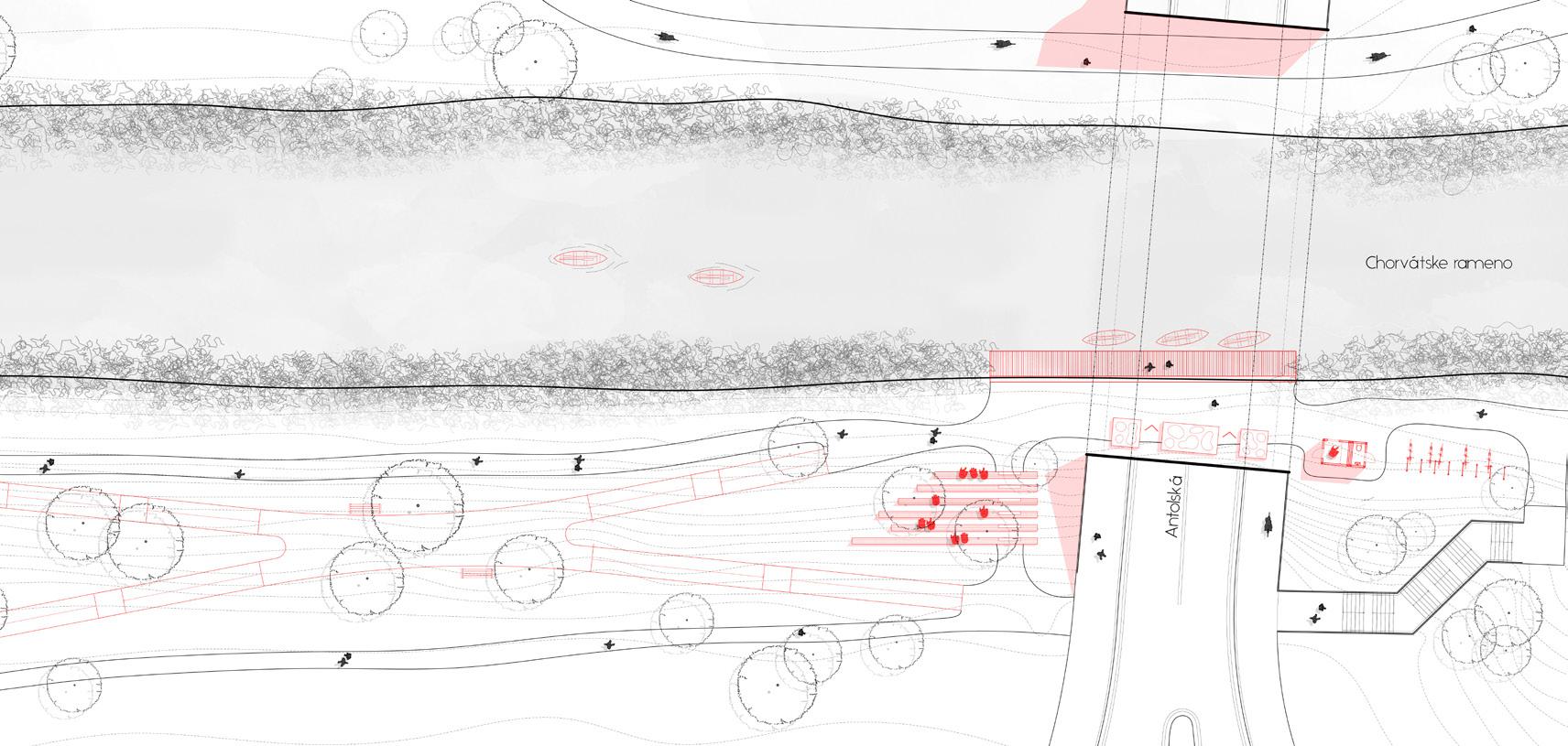 BRATISLAVA / MESTO / PETRŽALKA / ANTOLSKÁ / PARK / RIEKA / MÓLO / IDENTITA / Tieto slová boli prvými, ktoré sme opakovali pri obhliadke územia. Mestský park dostáva ideu člnkovania na kratšom úseku s cieľom dodať miestu štvrtý rozmer, identitu. Návrh spočíva v modulárnosti panelu tvoriaceho plávajúce mólo kotvené do existujúceho bet. múriku. Celý objekt spolu so zázemím sa zmestí do skladobných rozmerov lodného kontajneru, čo umožňuje rýchlu prepravu a následnú montáž a demontáž. Potenciál atraktivity parku nás donútil pridať pobytové schodisko doplnené o tieniacu zeleň, slúžiace celému územiu. Atraktivitu priestoru zabezpečuje nielen pridanie nových prvkov, ale aj zachovanie pôvodných hodnôt priestoru.