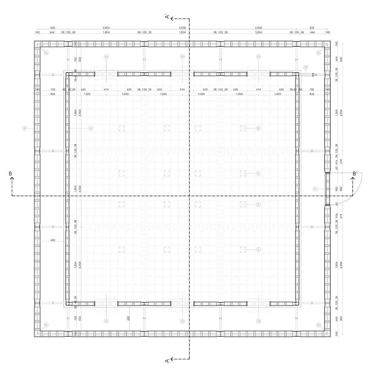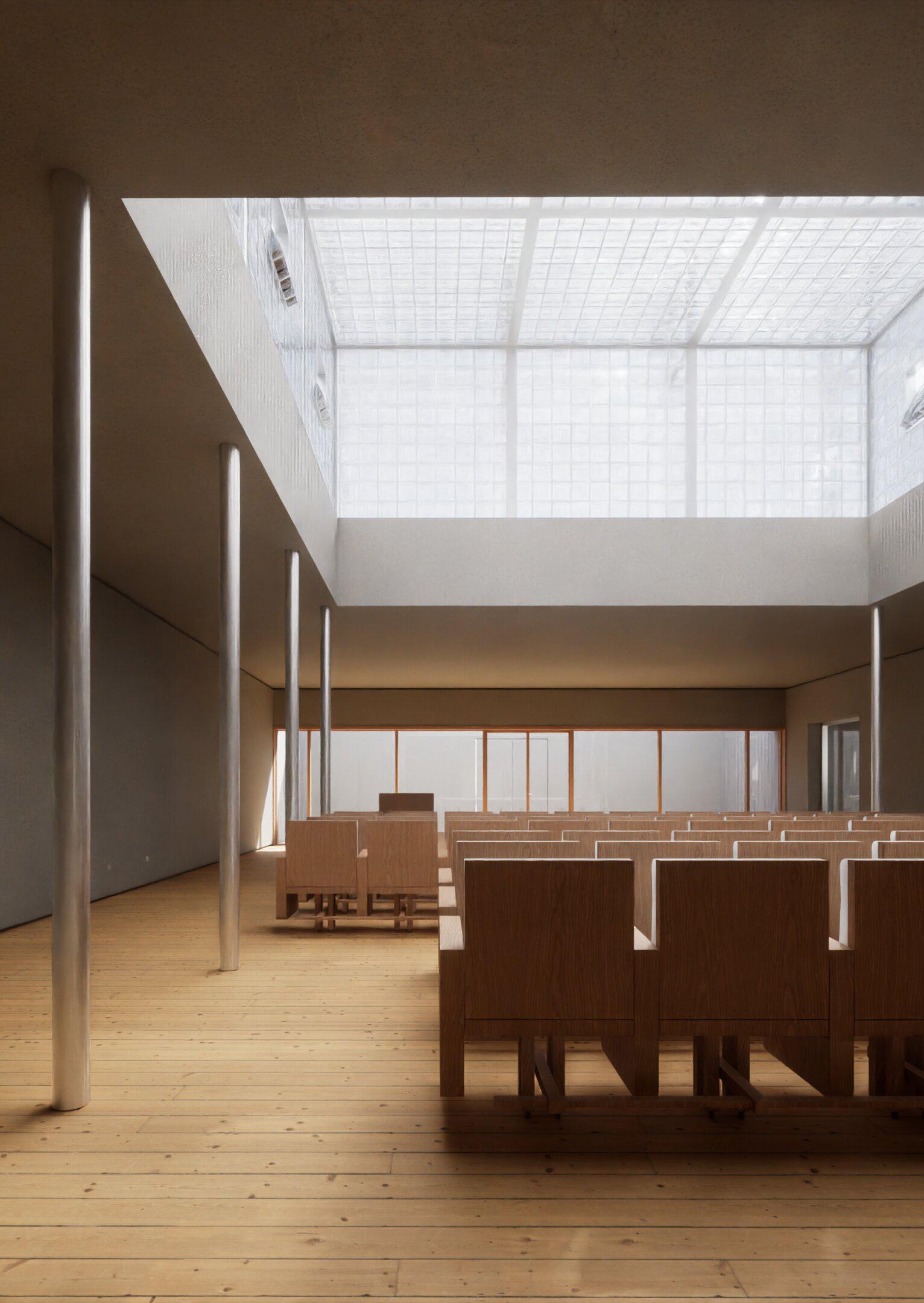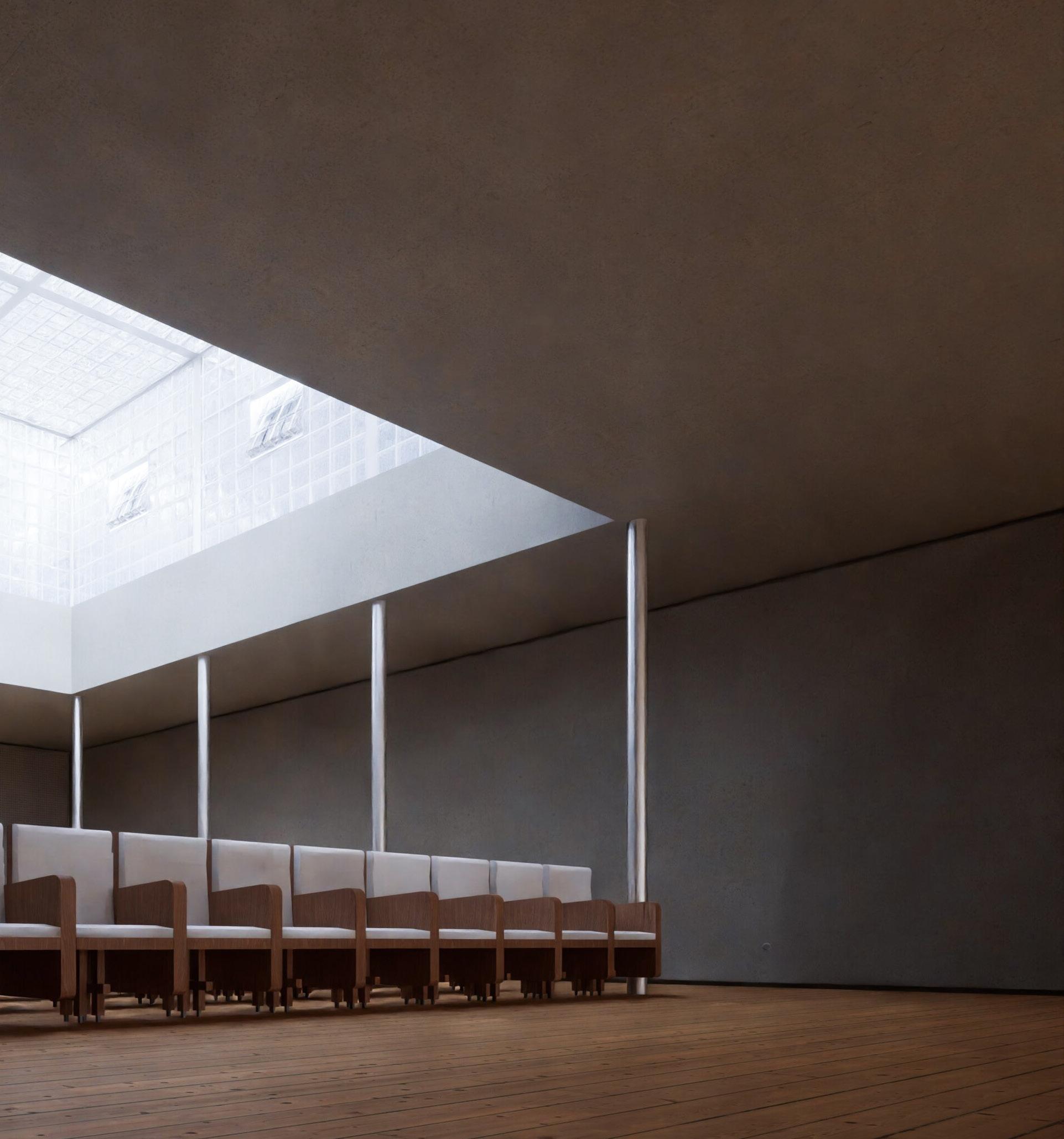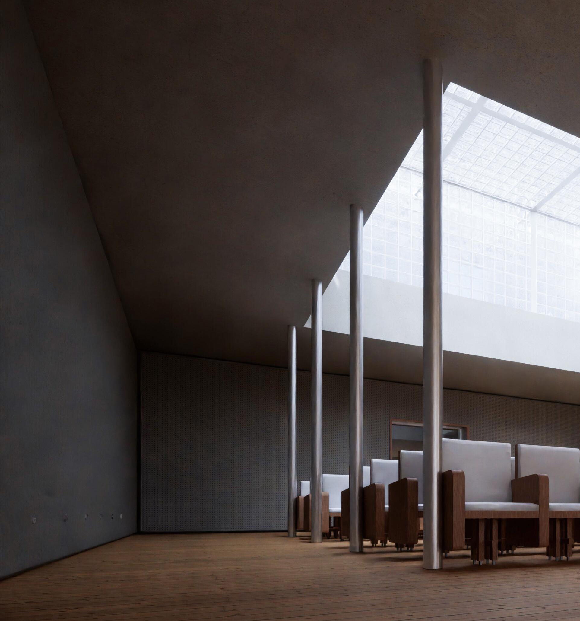 Koncipovanie hlavnej sály sa stalo predmetom uzavretého priestoru zo štyroch strán s otvorenou strechou, Translucentný strop navodzuje pocit neba, nekonečne vysokého priestoru kam všetko uniká.