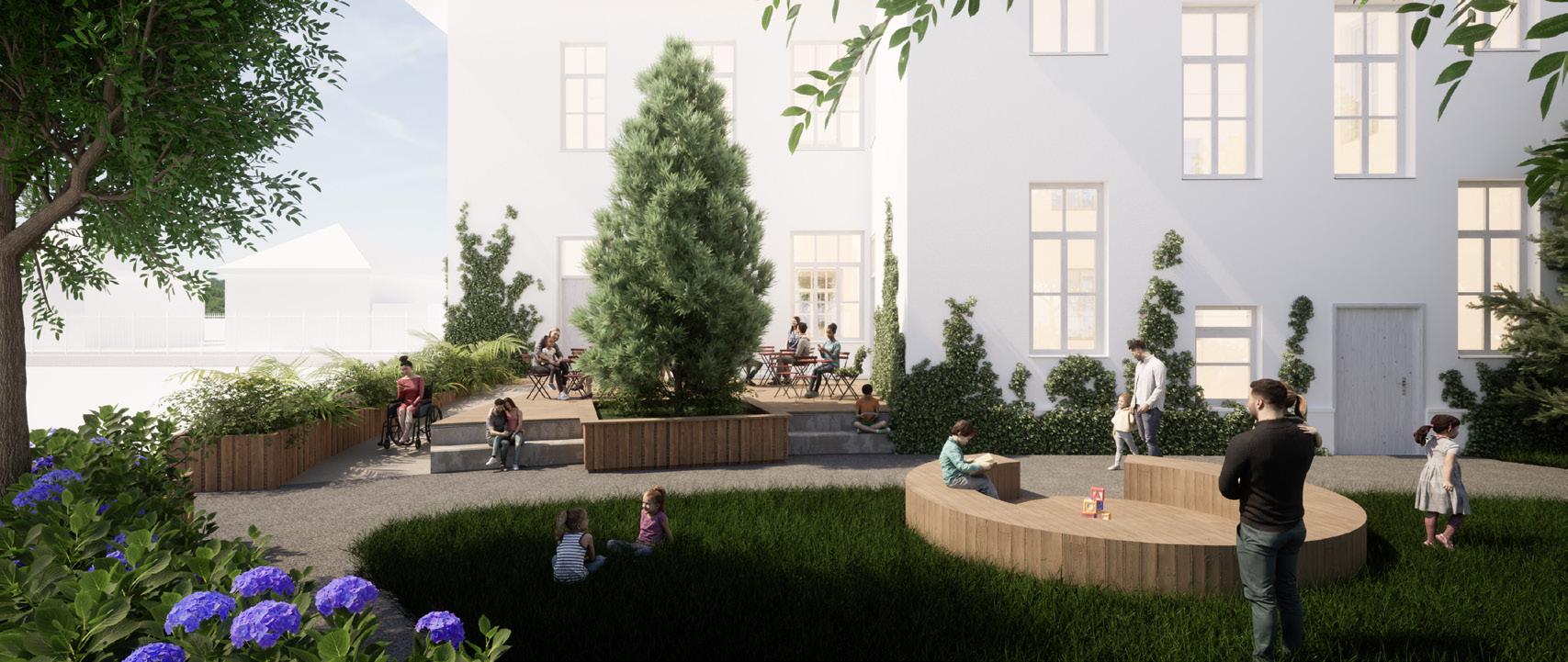 Návrh zadnej časti dvora ktorý svojim priestorom poskytuje zázemie pre množstvo funkcií. Plocha pozostáva zo spoločenského, kaviarenského sedenia, zelenou, oddychovou zónou a pobytovou časťou s priestormi na výučbu a rozvoj tých najmenších. Do tohto exteriérového priestoru vedú z budovy troje dvere, v rozličných výškových úrovniach. Návrh reaguje na tento problém spôsobom, že dorovnáva výškové úrovne do jednej nivelety, pomocou terasy s rampou mierneho sklonu. Rampa sa postupne otvára do väčšieho priestoru s množstvom zelene, v ktorej sú zapustené kruhové exteriérové plochy s lavičkou po obvode, ako forma triedy, pre menšie skupiny študentov. Priestor dvoru je ďaľej doplnený o ľahkú, multifunkčnú konštrukciu.