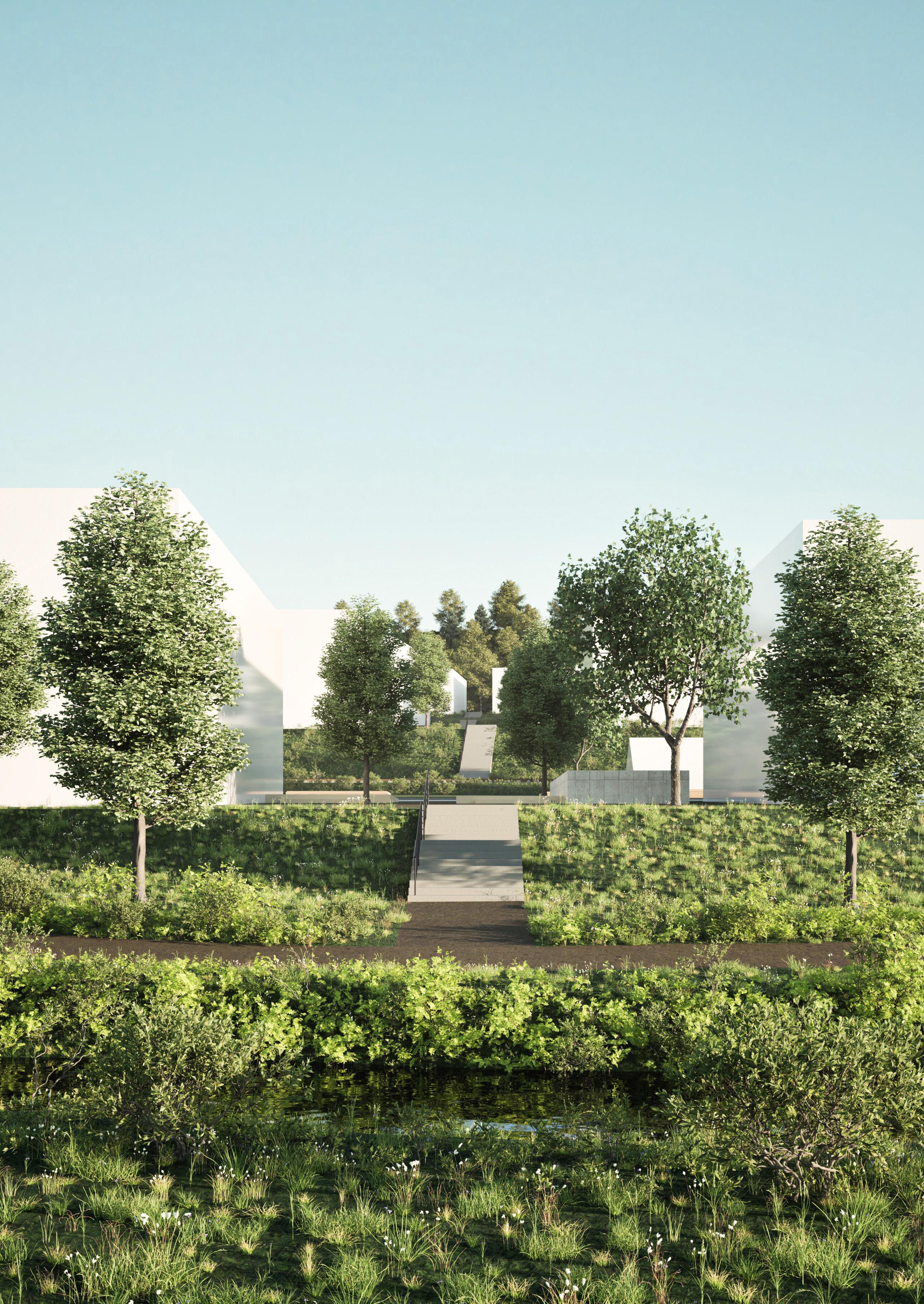 Usporiadaním prevádzok domu smútku do kruhu vzniká medzipriestor. Tento koncept vytára z exteriéru simplicitnú deliacu hmotu a zo strany interiéru ponúka imtímny priestor.