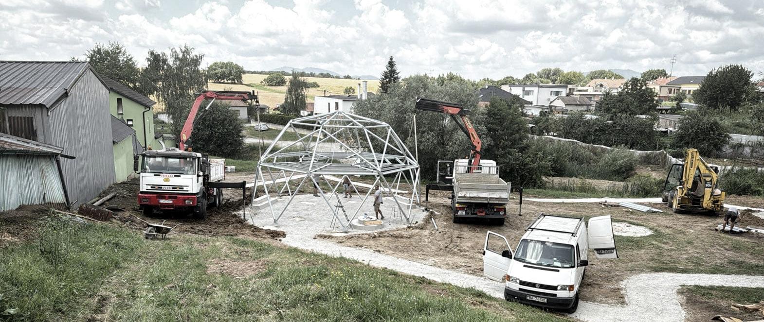 Konštrukcia | Statická schéma pavilónu je tvorená pôdorysnou sieťou. Drevená konštrukcia je spájaná oceľovými kĺbmi v prekrižovacích bodoch vytovrených spájaním osí.