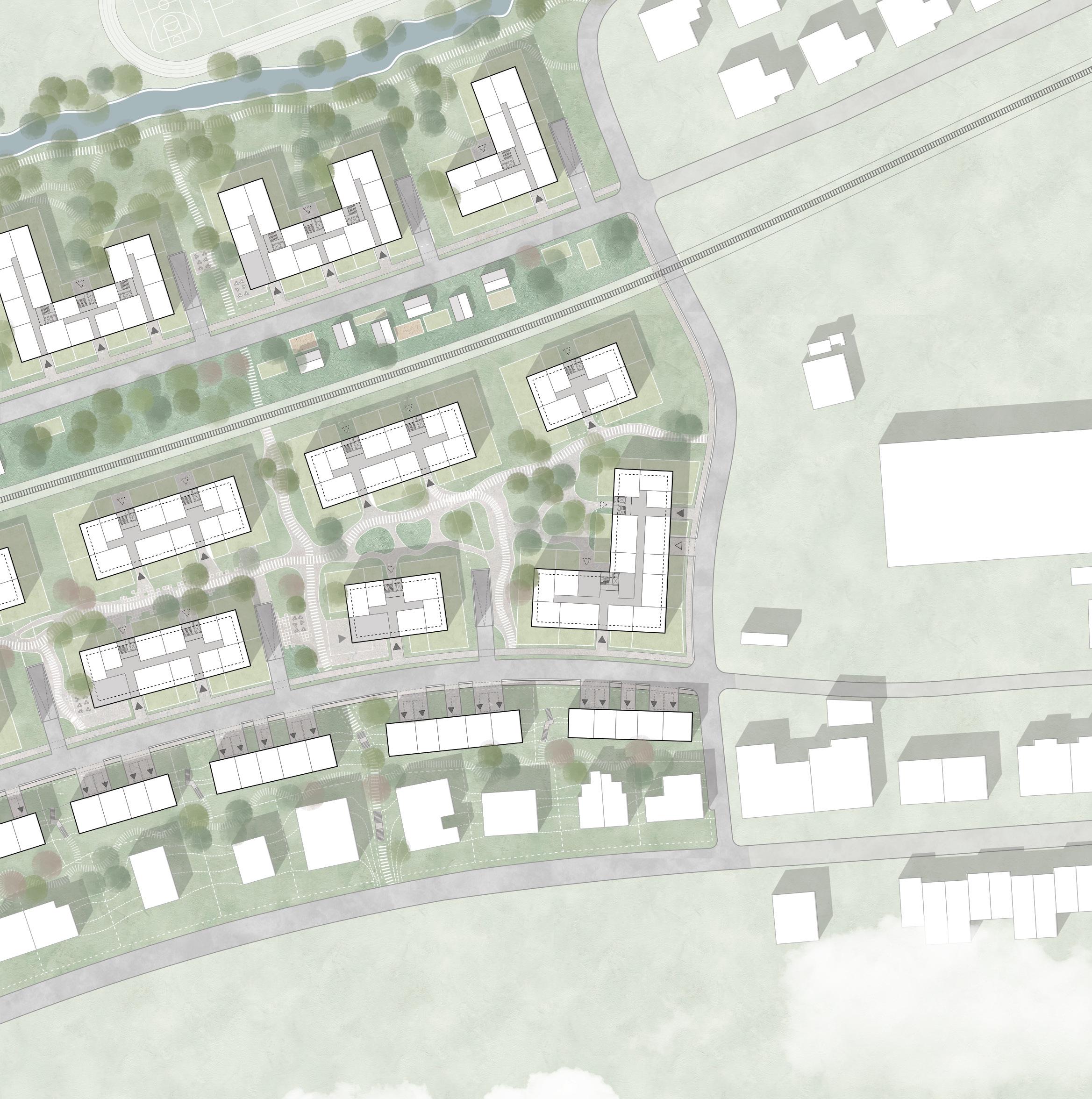Novo navrhnuté bytové jednotky dotvárajúce blok sa nachádzajú na existujúcich pozemkoch zástavby, v tesnej blízkosti stanice. V princípe ide o vybudovanie domu na záhrade, ktorý funguje ako samostatný byt, čím sa zvýši hustota a využitie pozemkov.