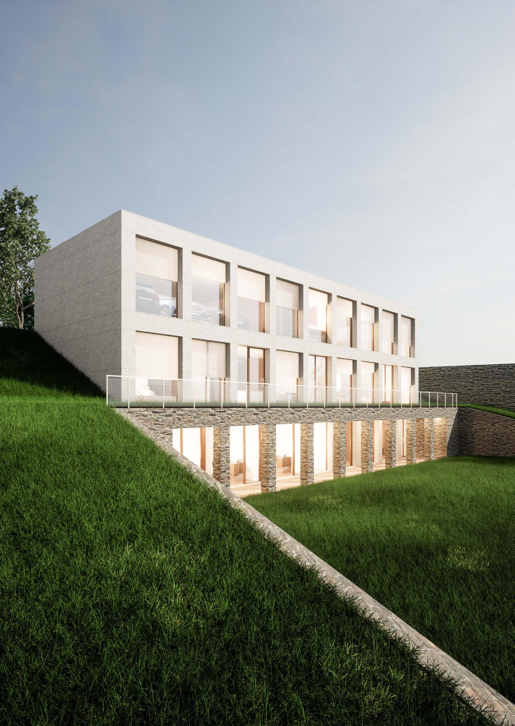 Predelenie pozemku trojpodlažnou hmotou pre získanie maximálnych počtov výhľadov z dispozičného riešenia.