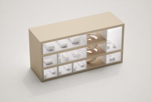 Deliaci prvok skrine pomáha vytvárať priestory pre dočasný odpočinok, barový pult, skladebné miesto a VZT.
