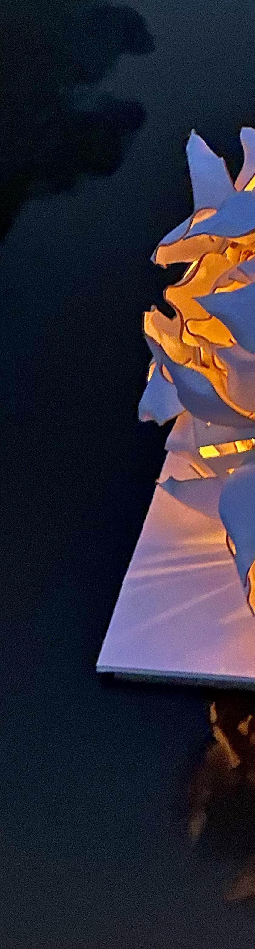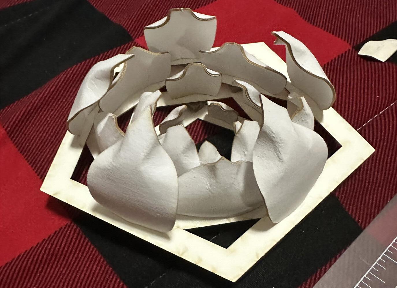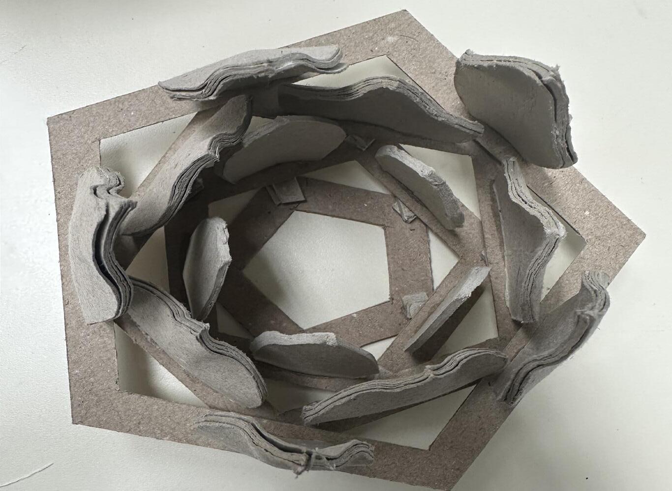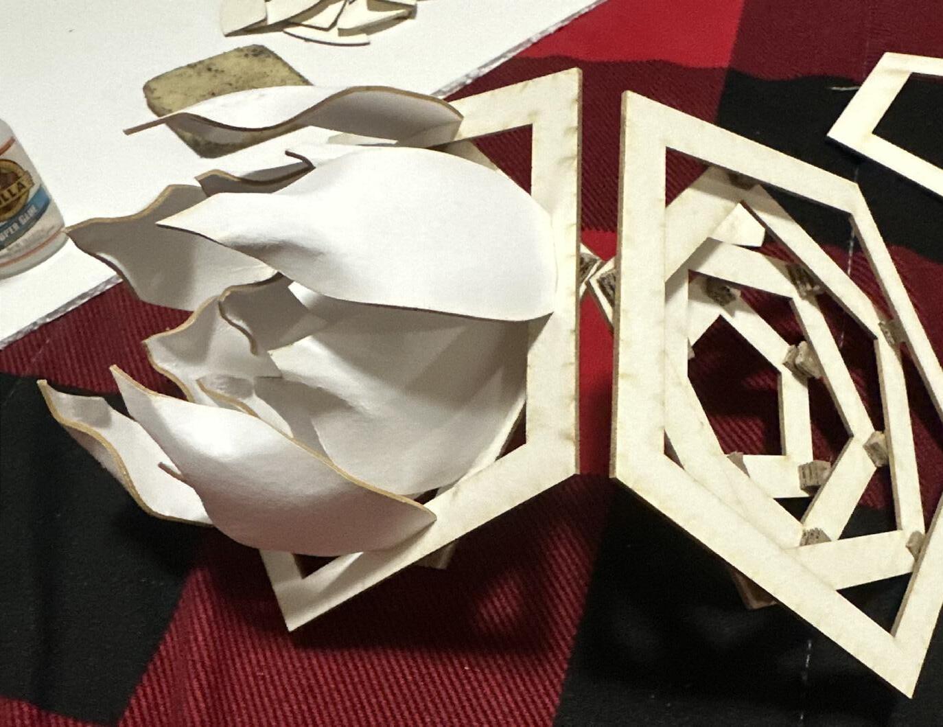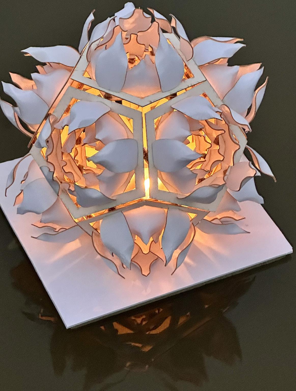 Section cut of the original design of one side of the original design. For this design the pentagonal faces were inverted so each petal could be one layer lower than the previous one.