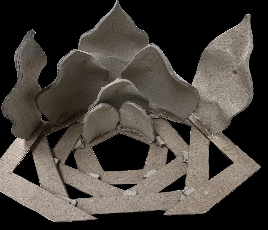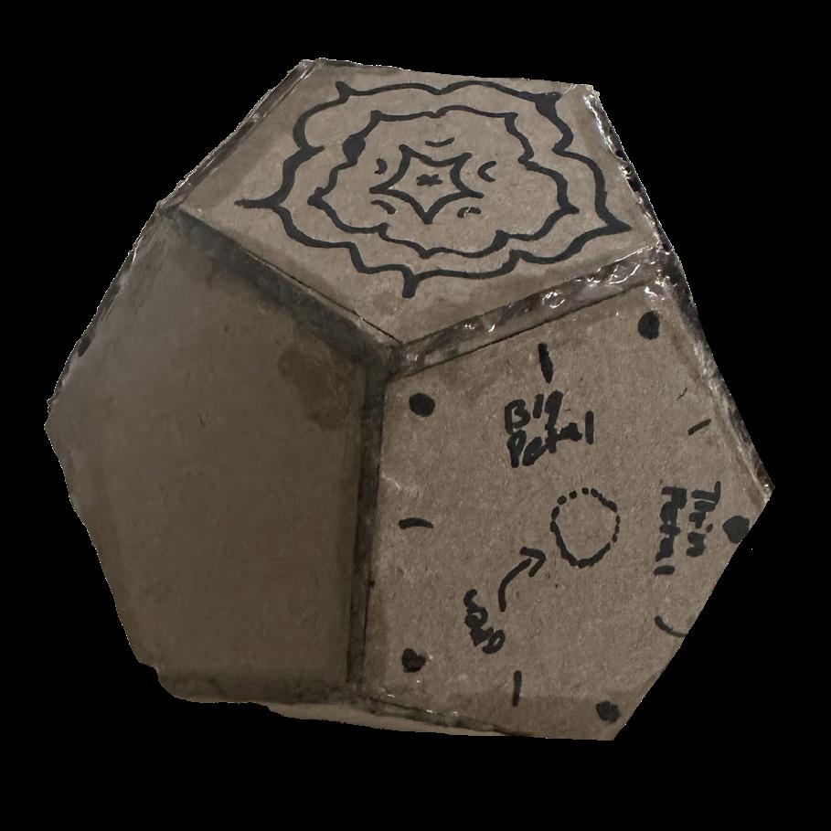 A ball of flower petals was used as the chosen design to be placed on each pentagonal shape. These petals are inspired by the lotus flower as it has similar resemble to a pentagonal shape. The final design was a merged lotus flower on the each pentagonal face of the truncated icosahedron shape