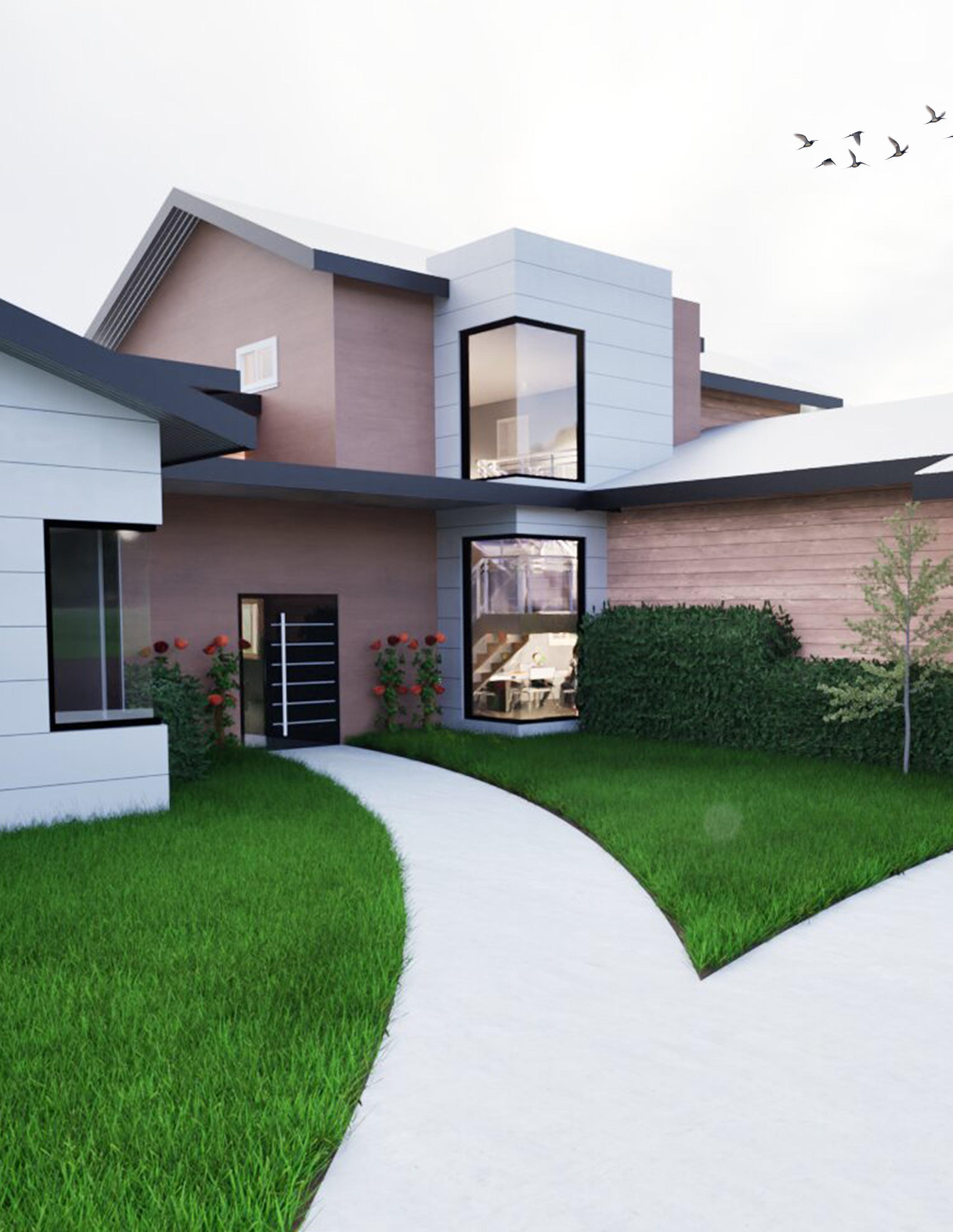 The home design is an innovative modern farmhouse style. The inspiration for this design was that using multiple types of materials for a home gives it a distinct look compared to the surrounding neighborhood. The layout of the home was designed in a non linear way to give it aspect to all sides of the home.