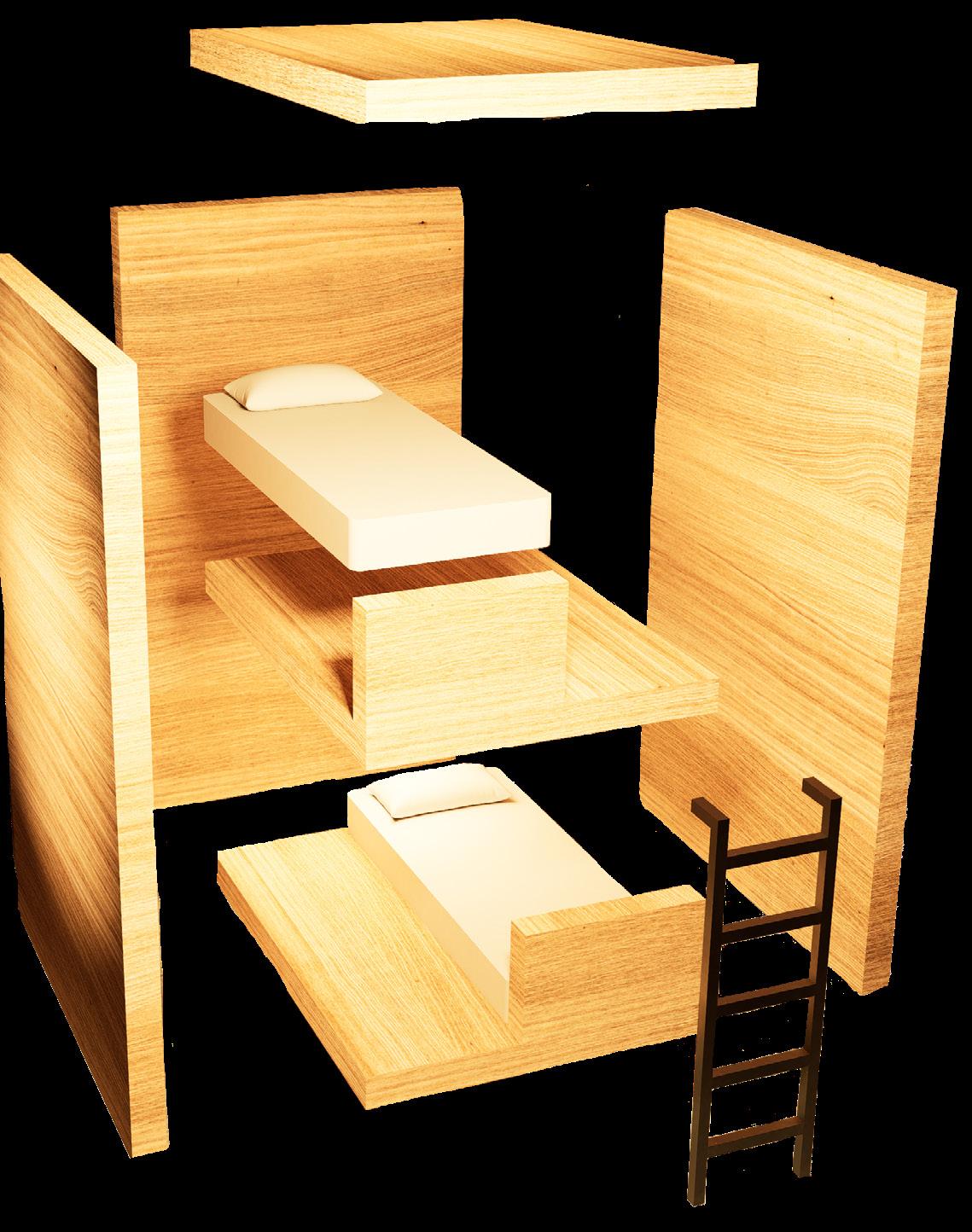 To solve the space problem, a bed system was created to ensure that each floor was used to its fullest potential. This cubical system is designed to create the most space possible while allowing the feeling of your own private space within the cubical. This system is so efficient that it host two people per cubical, and each cubical can be placed side by side to ensure that the space is used up properly.