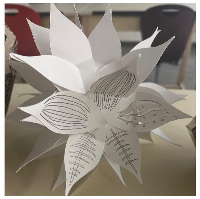 Top View of pentagonal face. The blooming flower effect is made for each side of the truncated icosahedron shape. After reaching the final stage of modeling a problem arose with the weight. The original material used was too heavy and prevented the model from floating