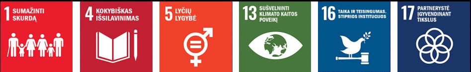 • 16 tikslas – skatinti taikias ir įtraukias visuomenes darniam vystymuisi, suteikti visiems galimybes reikalauti teisingumo ir kurti veiksmingas, atsakingas ir įtraukias institucijas visais lygiais;