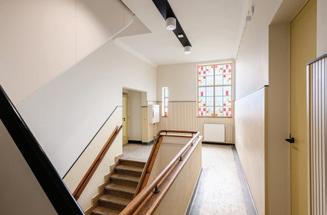 sanitair en een nieuwe pantry; uiteraard is er ook een groepskeuken voor wie liever niet in zijn eentje eet. De begane grond is toegankelijk gemaakt voor mindervaliden en een nieuwe lift leidt naar de studio’s op de verdiepingen. Dat is nu een verdieping meer, doordat er een nieuwe bouwlaag is toegevoegd voor extra ruimte voor de gemoderniseerde studio’s.”