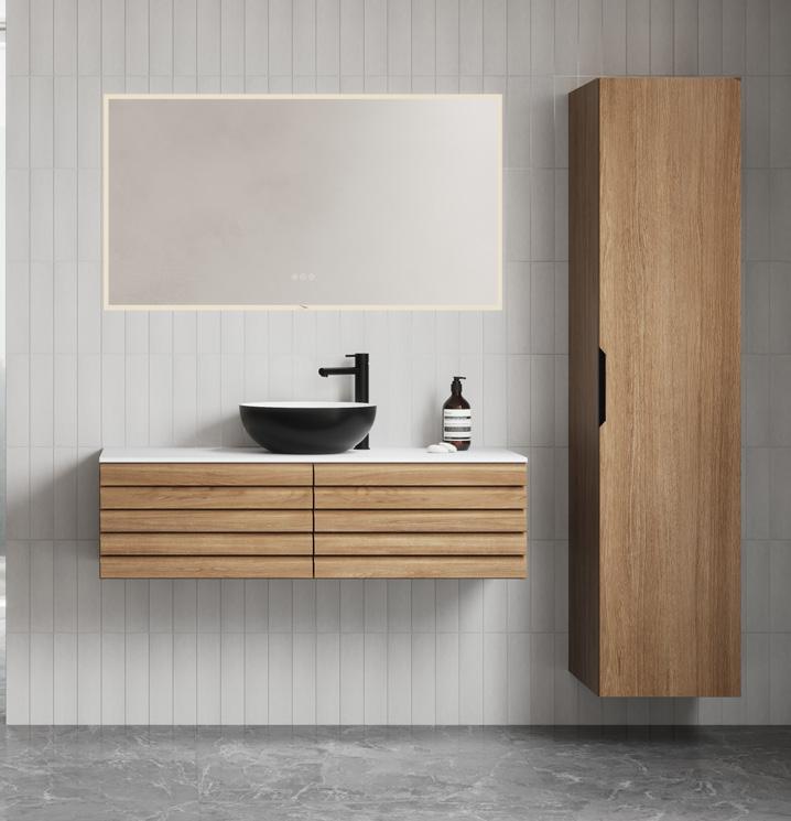 SELMA sort eik stavet 120 cm. Corianplate med NORE servant i porselen. VANGE speil m/sort ramme og høyskap 40 cm med hyller.