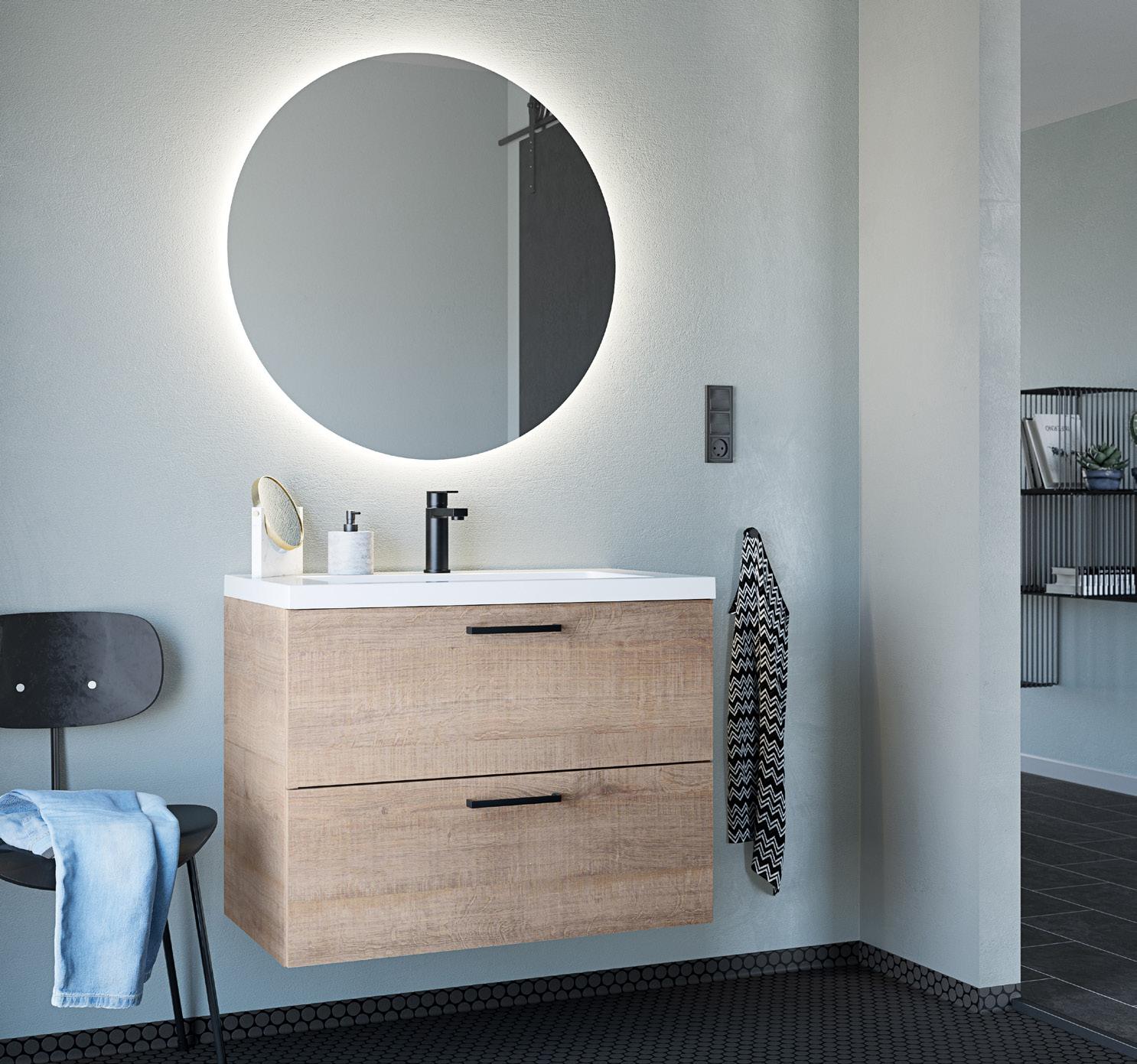 Skap og skrog i skogsgrønn. Servant Top Solid. Skuffeinndeling, bunnventil og vannlås Easy Clean er innkludert. Rundt speil med lyskant LED 12.