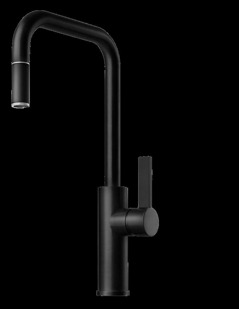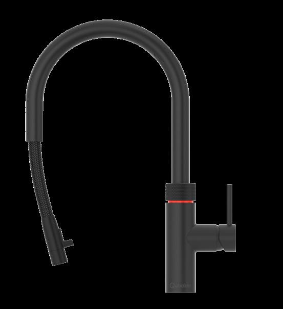 Kjøkkenbatteri med fleksibel sort slange. 120 grader svingbegrensning. Velg mellom vanlig stråle og dusjstråle. 8 liter vann pr min. Kaldstart. Krom.