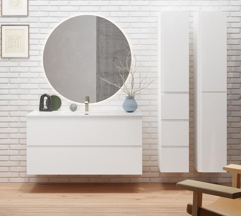 MARI Hvit matt 120 cm med HEINE servant i porselen. FYLI speil med dimmer og høyskap 40 cm med hyller.