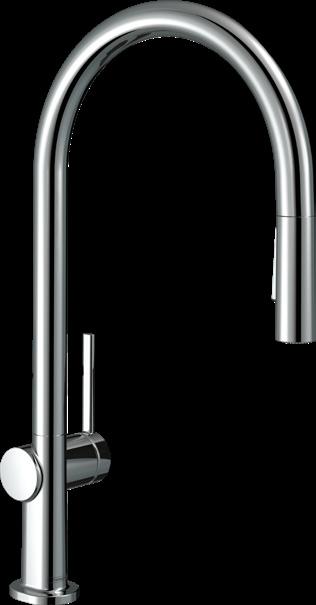 Kjøkkenbatteri med uttrekkbar dusj og to stråletyper. Låsbar dusjstråle, strålen skiftes med trykknapp og stilles automatisk tilbake når den slås av.