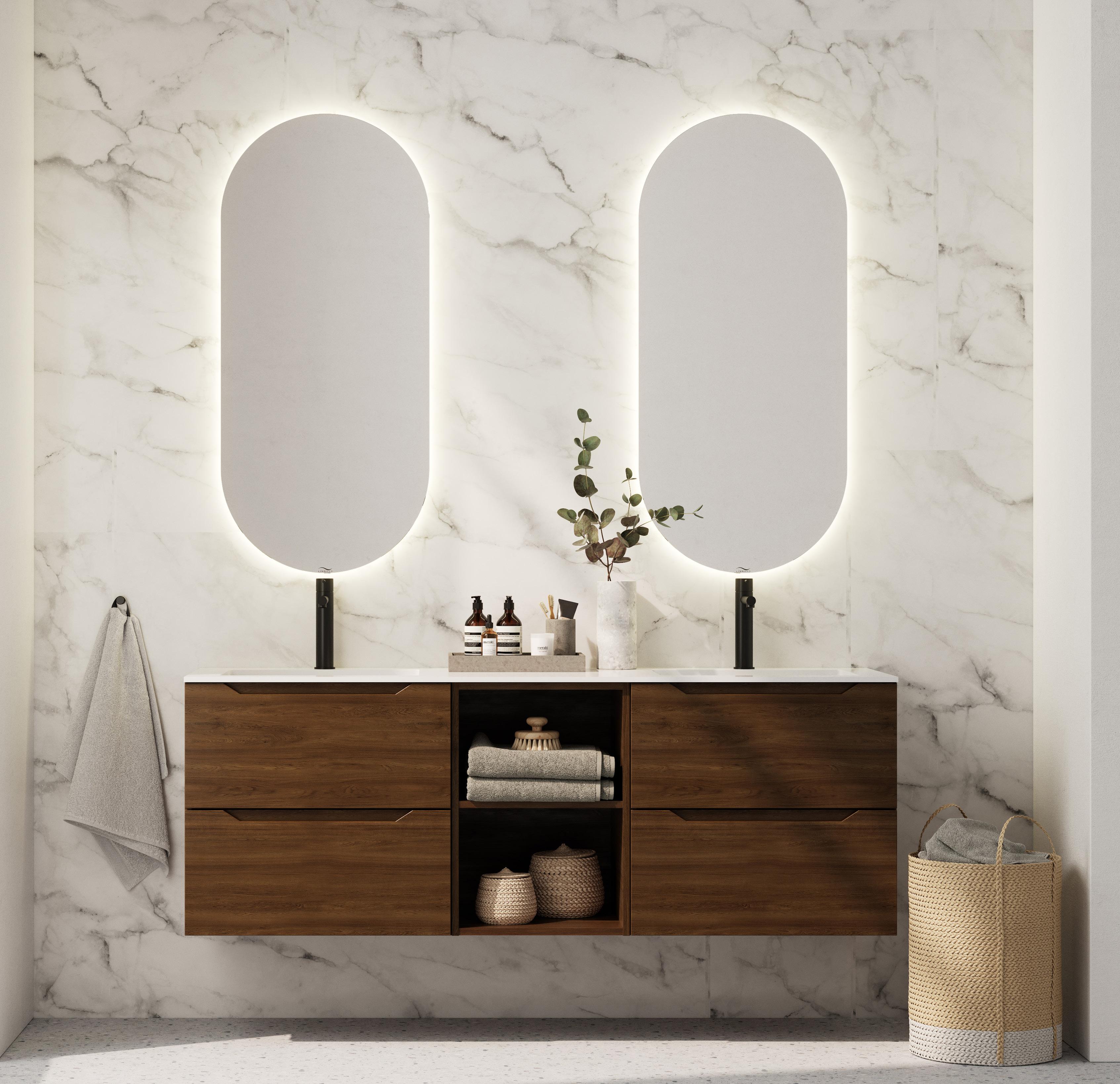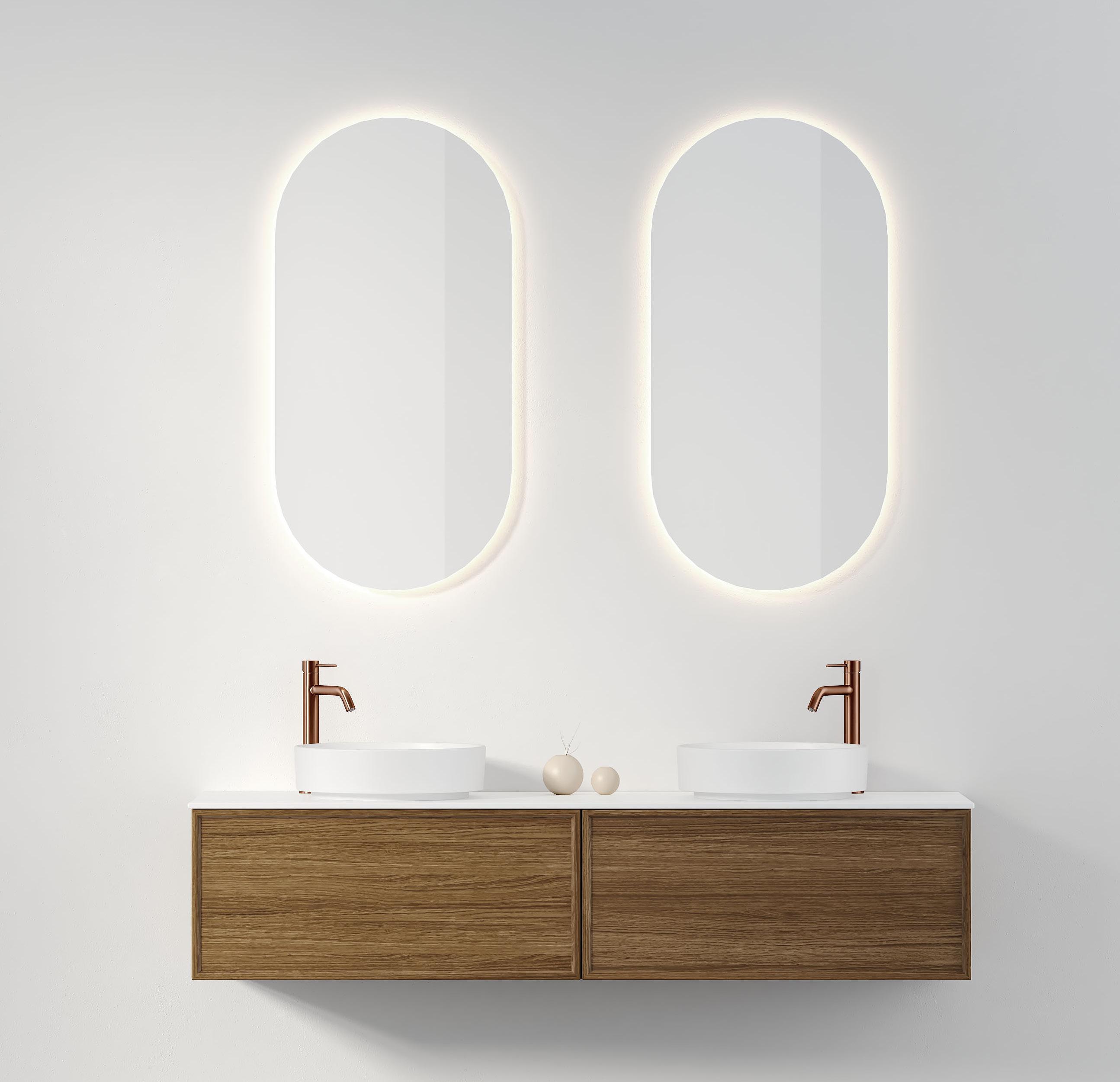 EMMA mørk eik 60 cm x 2. Åpen hylle 40 cm. Corianplate med 2 servanter EIR. TISTEL ovalt speil med baklys.