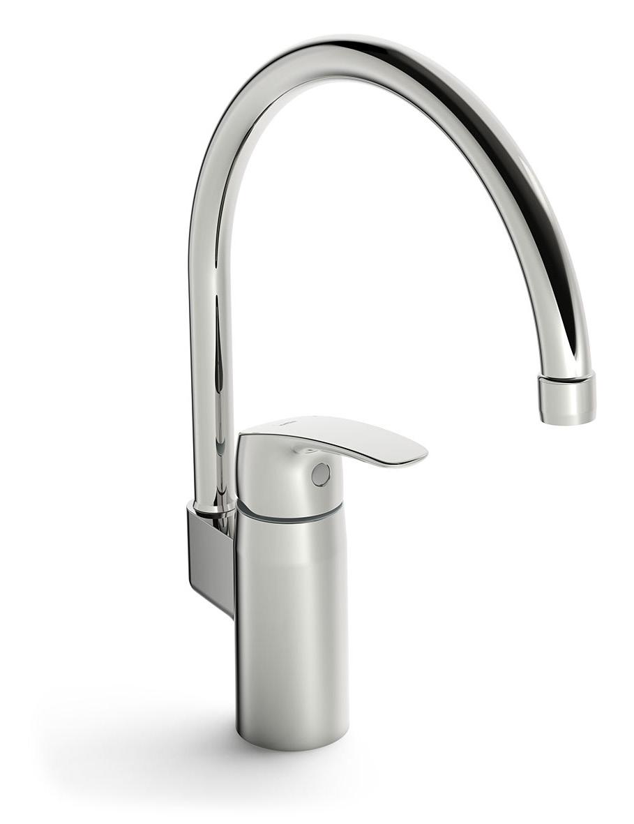 Kjøkkenbatteri med klassisk buet tut. Batteriet er utstyrt med praktisk øko- og sikkerhetsfunksjon, som kan begrense vannmengde og temperatur, noe som gjør den enkel og trygg å bruke for hele familien.