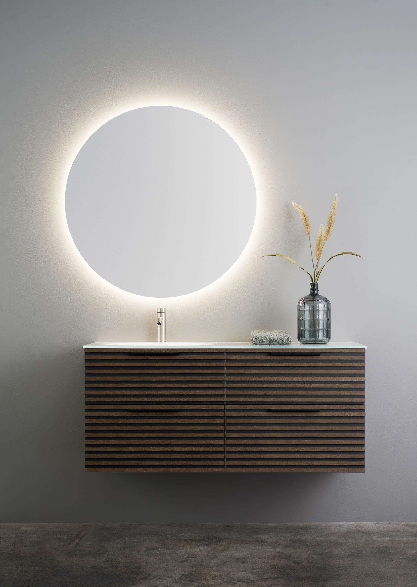 Oppsettet består av: Crown Stripe servantskap, 120, Brun/sort med Edge Hvit glasservant. 8912449. Speil rund, Ø90 med ambilight, bakgrunnsbelysning. 7038824. Kan også leveres med andre servantløsninger.