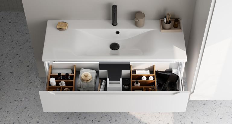 Velg vaskeromsmøbler som varer lenger enn vaskemaskinen. Få et velorganisert vaskerom med skuffeseksjoner. Tilgjengelig i fargene Hvit, Grå og Sort matt med Hvit eller Lys eik benkeplate.