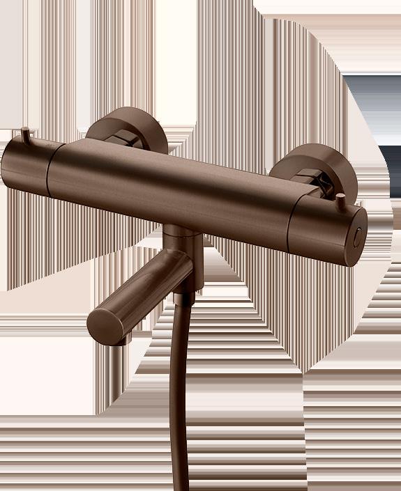 En dyp brent tone sammen med sorte detaljer skaper en sofistikert og trendy look. Passer ekstra godt med sandfargede fliser, naturlige elementer som mur og terracotta, med bronsefarget eller sort armatur.
