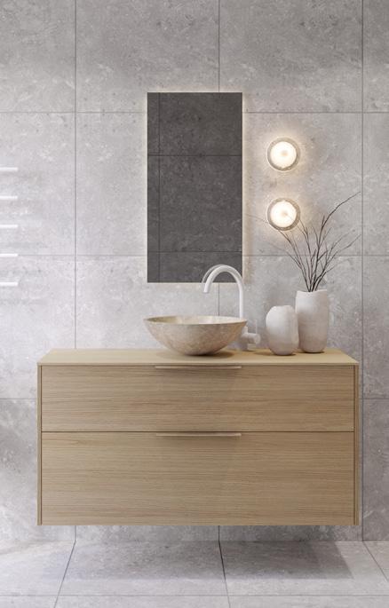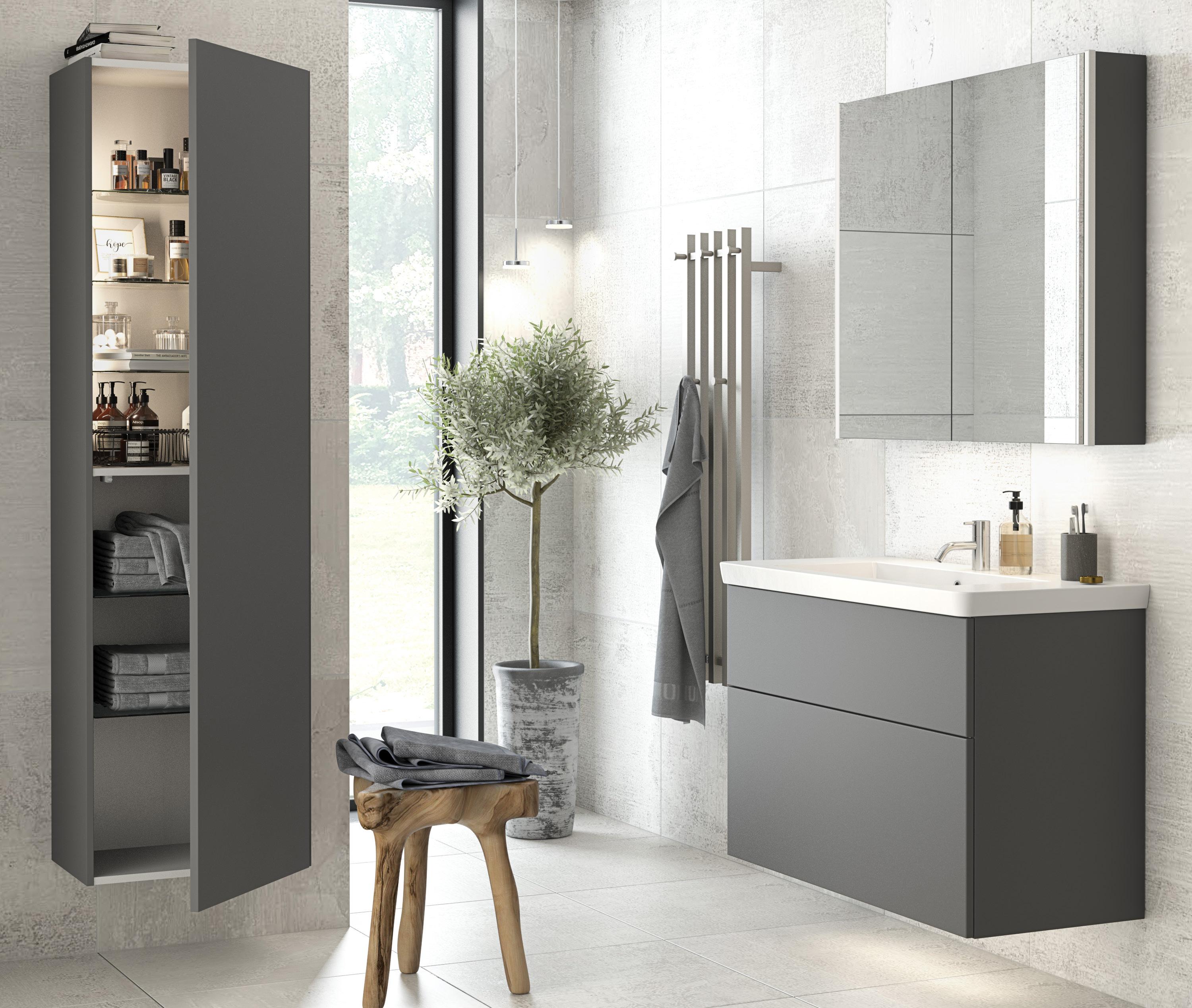VB2023009H VB Pris kr 39 040,Baderomsmøbel i grå matt med to skuffer og push-open. Inkludert Larghetto porselensservant, og Ambi speilskap med LED-lys og lysstyring. Høyskap.