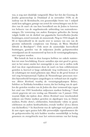 was, is nog niet duidelijk vastgesteld. Maar het feit dat Goering de Joodse gemeenschap in Duitsland al in november 1938, in de nasleep van de Kristalnacht, een gezamenlijke boete van 1 miljard mark kon opleggen, getuigt van zowel de verwachtingen van de leiders van de nazi’s als van hun bereidheid om de Joden te beroven ten behoeve van de ongelimiteerde uitbreiding van naziondernemingen. De verovering van andere Europese gebieden die hierop volgde leidde tot de diefstal van gigantische hoeveelheden Joodse bezittingen, zowel roerende als onroerende. Nog in 1944 slaagde de SS er bijvoorbeeld in de macht over te nemen van een van de grootste industriële complexen van Europa, de Weiss Manfred fabriek in Boedapest12. Ook moet de aanzienlijke hoeveelheid bezittingen, gestolen van de miljoenen Joodse gedeporteerden voorafgaand aan de massamoord op hen in de vernietigingskampen, niet vergeten worden. Wat betreft de buit in deze kampen hebben we enkele statistieken tot onze beschikking. Exacte aantallen zijn niet goed te geven, niet in het minst omdat het onmogelijk is om vast te stellen welk deel van deze eigendommen door de nazi’s en hun collaborateurs gestolen is, hoeveel er langs onbekende weg verdwenen is, of hoe de schattingen tot stand gekomen zijn. Maar in dit geval bestaat er wel enig bewijsmateriaal. Tijdens de Neurenbergse processen werden bijvoorbeeld bewijzen aangedragen in verband met de zogeheten Aktion Reinhard, waarbij de vernietigingskampen Belzec, Sobibor en Treblinka betrokken waren, dat het bedrag van de spullen die gestolen werden van de Joden die daar vermoord zijn, tegen het eind van 1943 honderden miljoenen marken bedroeg.13 Arad citeert gegevens uit een verslag aan Himmler van 5 januari 1944, waaruit blijkt dat tijdens deze Aktion Reinhard voor tweehonderd miljoen aan Duitse marken gestolen en afgedragen was, in Duitse marken, Poolse zloty’s, edelmetalen, buitenlandse valuta in goud, edelstenen en andere kostbaarheden, evenals ‘stoffen’ (d.w.z. kleren van slachtoffers).14 In Auschwitz was de opbrengst veel groter, zoals ik met eigen ogen gezien heb. Alle persoonlijke eigendommen die de gedeporteerden bij zich hadden werden onmiddellijk in beslag genomen en overgebracht naar het sorteercentrum van het kamp, 437