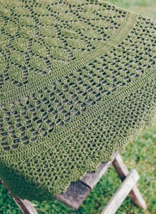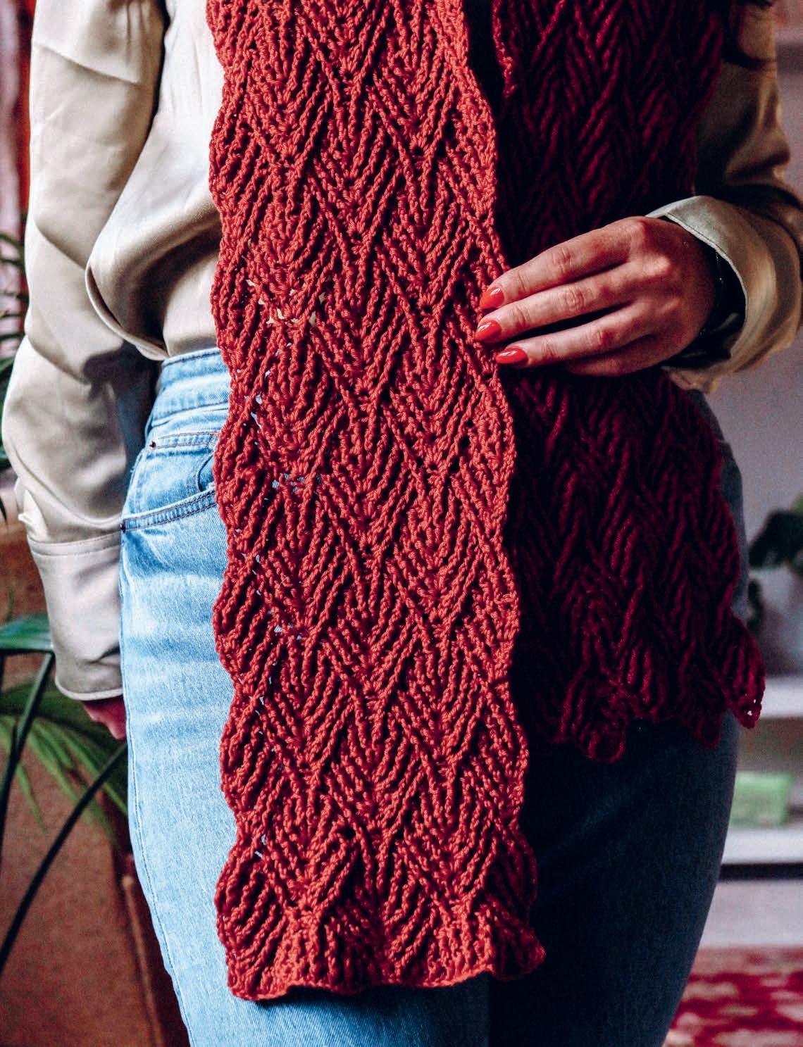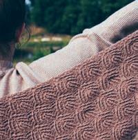 Deze sjaal is voor mij misschien wel de meest bijzondere sjaal in dit boek. Het stekenpatroon zat al jaren in mijn hoofd en heeft vele versies gekend, tot het voor deze sjaal de uiteindelijke perfecte vorm kreeg. De uitlopende waaiers doen denken aan een klassiek art-decopatroon.