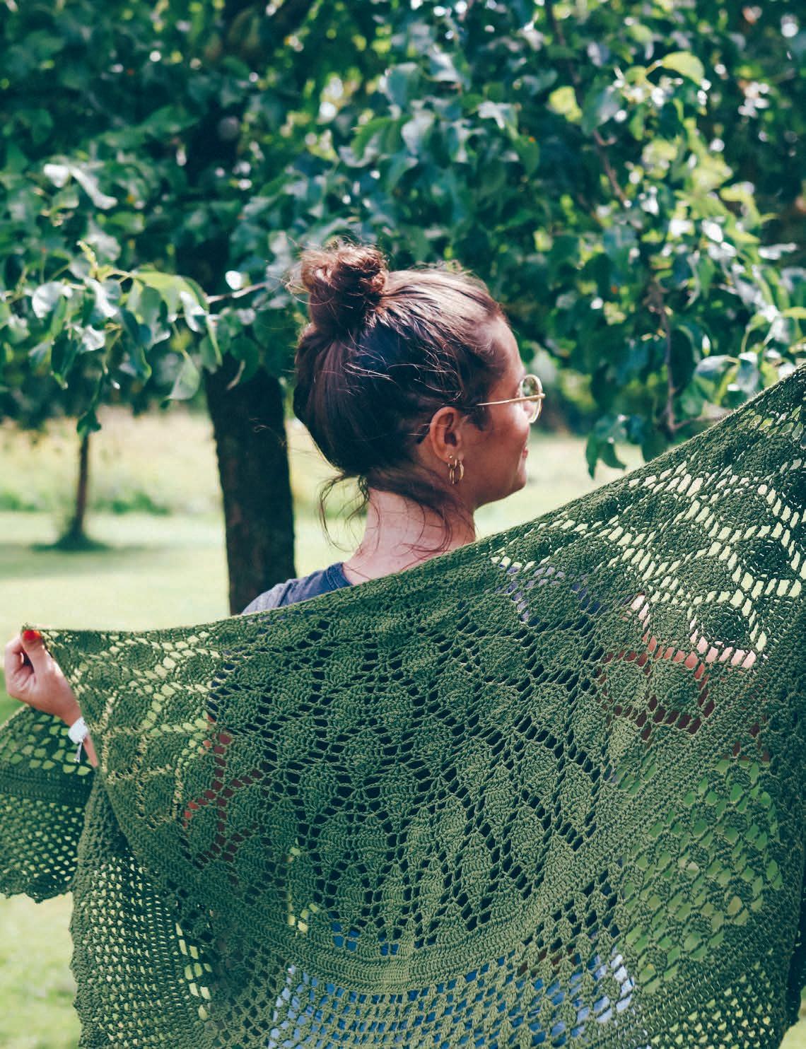 De Botanische Sjaal is een bijzondere omslagdoek met verschillende stekenpatronen. De haaksteken zijn geïnspireerd door de natuur, zoals ook zichtbaar in het mooie bladermotief. De vorm van de sjaal is halfrond met iets uitlopende punten, waardoor deze ook erg mooi en sierlijk is om te dragen.