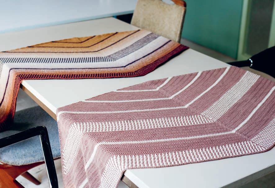 Hieronder zie je de Reflectie Sjaal, gehaakt in verschillende garens. Het patroon en de gebruikte materialen vind je op P.89.