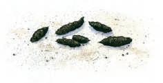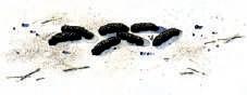 De ontlasting is wals- of worstvormig, maar slechts aan één uiteinde toegespitst. Meestal zijn de uitwerpselen glanzend zwart, maar dit kan variëren afhankelijk van het voedselaanbod en de gezondheidstoestand van het dier.