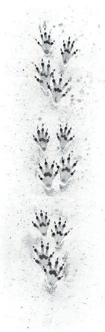 De voorpoten zijn in de loopsporen – heel typisch voor muizen –aanzienlijk kleiner dan de achterpoten. Bij alle vier de voeten zijn de tenen, afhankelijk van het terrein, in de prent duidelijk zichtbaar: vijf tenen bij de achterpoten en vier tenen bij de voorpoten, want daar is de binnenste teen slechts rudimentair en zit erg hoog.