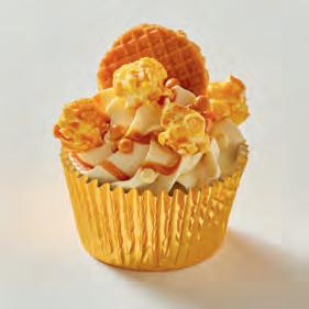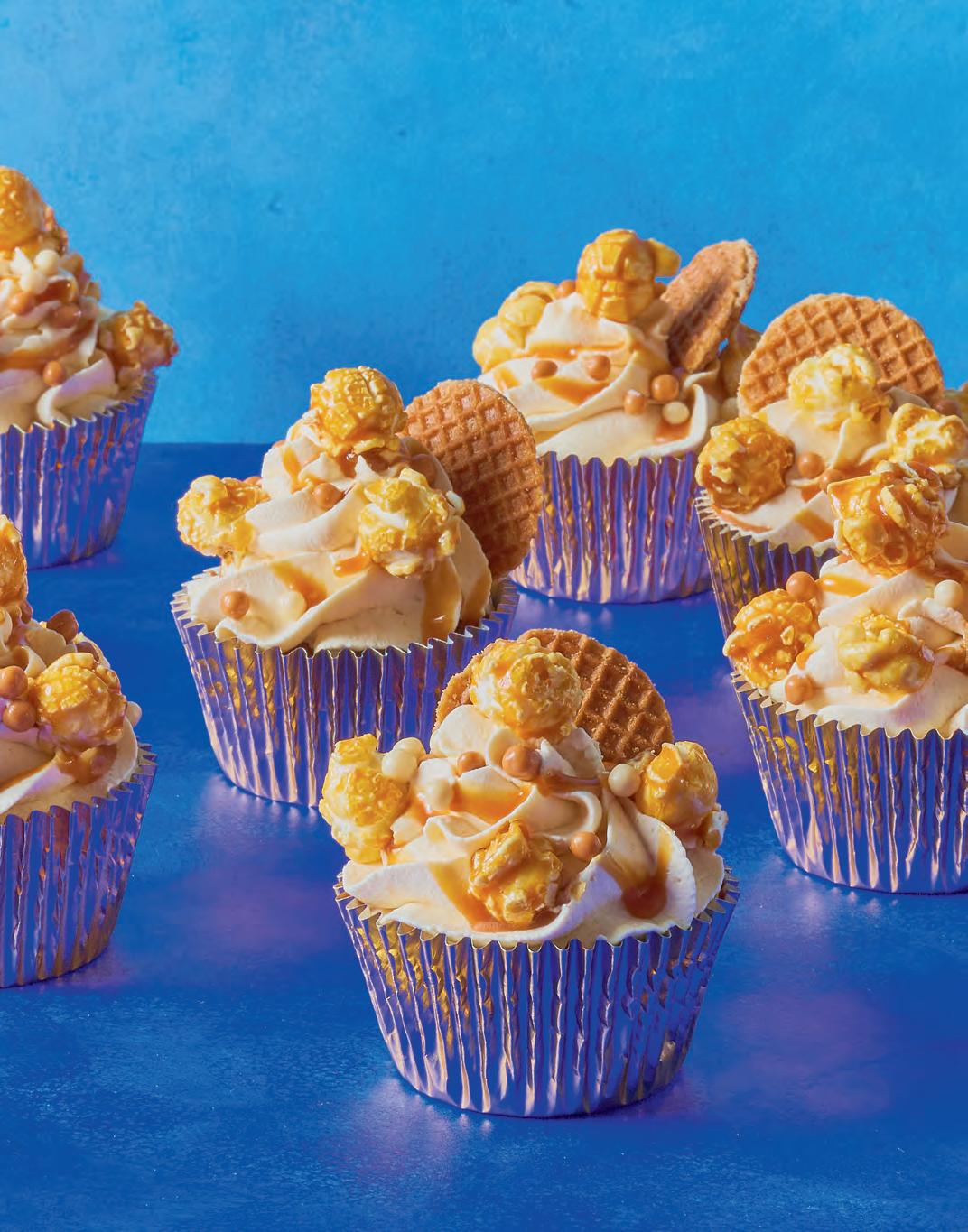 3. Klop de slagroom met de dulce de leche met de mixer stijf. Schep de slagroom in de spuitzak en maak mooie toefjes op de afgekoelde cakejes. Of schep er met een lepel een flinke schep op, dat is net zo lekker!! Drizzle er met een klein lepeltje nog wat extra dulce de leche over. Versier de cakejes elk met een stroopwafeltje en bestrooi met Strooifeest en popcorn.