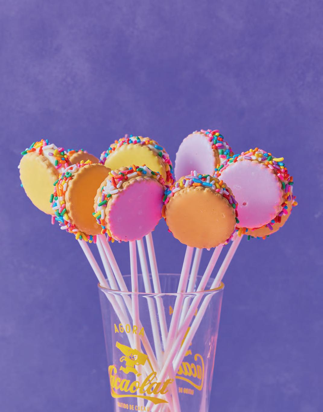 1. Bestrijk de likkoekjes met 1 theelepel chocoladepasta, leg er een lollystokje of satéprikker in en druk er een tweede likkoekje op. Druk aan en bestrooi de zijkant met sprinkles. Besmeer de zijkant ook goed met pasta, zodat de sprinkles goed blijven plakken. -