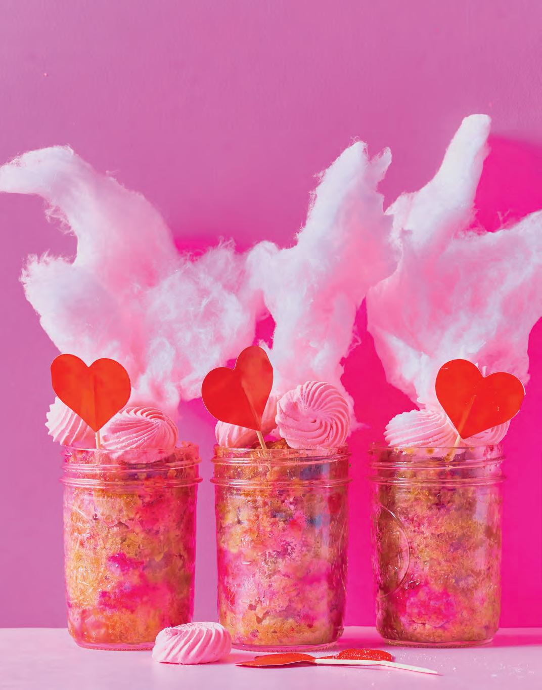 4. Verdeel het beslag gelijkmatig over de vier kopjes. Bak de mugcakes in het midden van de oven in ca. 20 min. goudbruin en gaar. Haal ze uit de oven (met ovenwanten natuurlijk) en laat ze ca. 15 min. afkoelen. Garneer ze met een toef suikerspin en de meringues. Eet ze lekker warm.