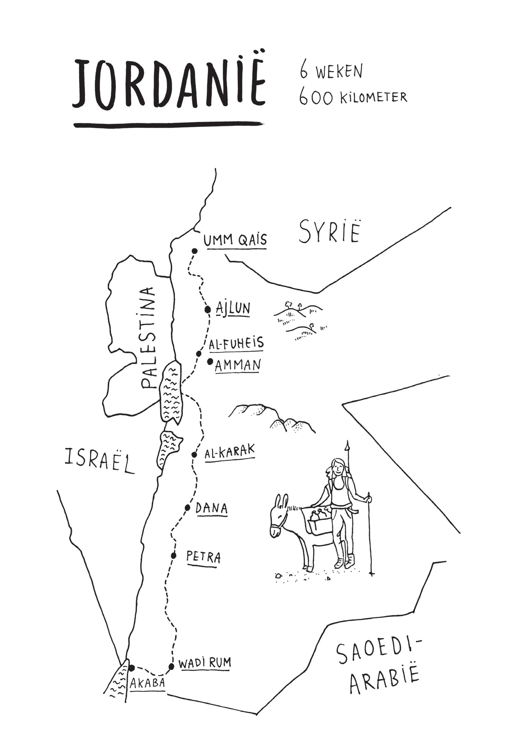 Over Jordanië bestaan de nodige vooroordelen en ik krijg ze allemaal te horen, als ik mensen vertel dat ik de Jordan Trail wil lopen. Dat is een langeafstandswandeling van 650 kilometer, die het land in de lengte doorkruist en je langs trekpleisters als Umm Qais, Petra en Wadi Rum leidt. Het was nooit eerder in me opgekomen om een bestaande route te gaan lopen, maar Miriam inspireerde me met haar verhalen over Te Aorora: een langeafstandswandeling door heel Nieuw-Zeeland. ‘Hoe langer en langzamer je door een land loopt, hoe hechter je band met dat land wordt,’ zei ze al in Bulgarije. Ik zocht de meest recent ontwikkelde routes in de wereld om iets te vinden wat nog door weinig mensen is belopen. Zo kwam ik op de Jordan Trail. Ik heb weinig ervaring in het Midden-Oosten, nog minder in de woestijn, en ik zie ernaar uit om weer iets heel anders te ervaren.