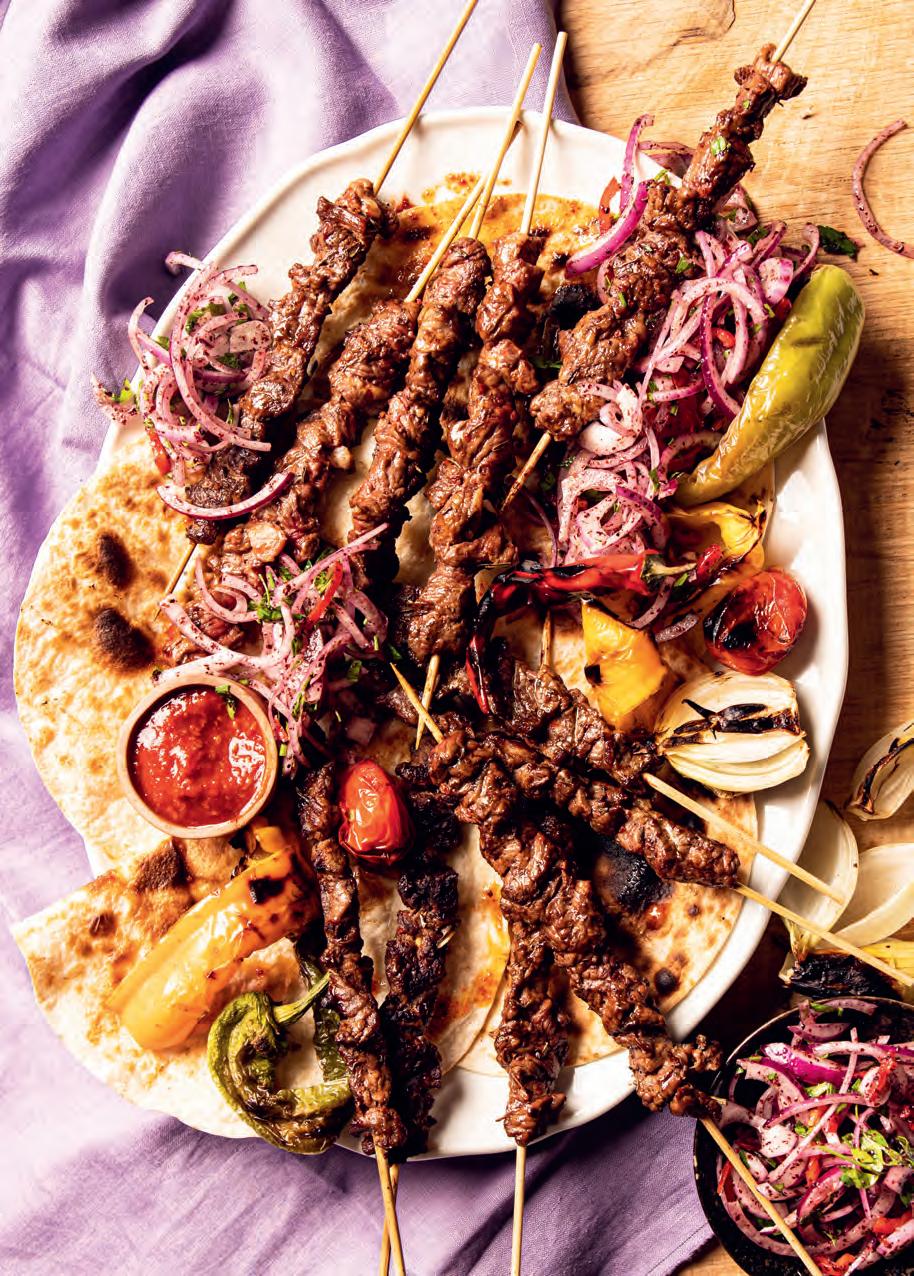 3. Snijd de groenten in stukken. Als alle lamsspiesjes gegrild zijn, gril je de groenten nog even in de grillpan of op de barbecue. Serveer met Sumak salatası (zie blz. 61).