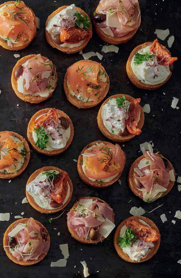 • Vul de taartjes als ze zijn afgekoeld met een beetje vulling en beleg ze bijvoorbeeld met gerookte zalm en een beetje citroensap; gerookte ham met een beetje Parmezaanse kaas; tomaatjes met olijven en basilicum…