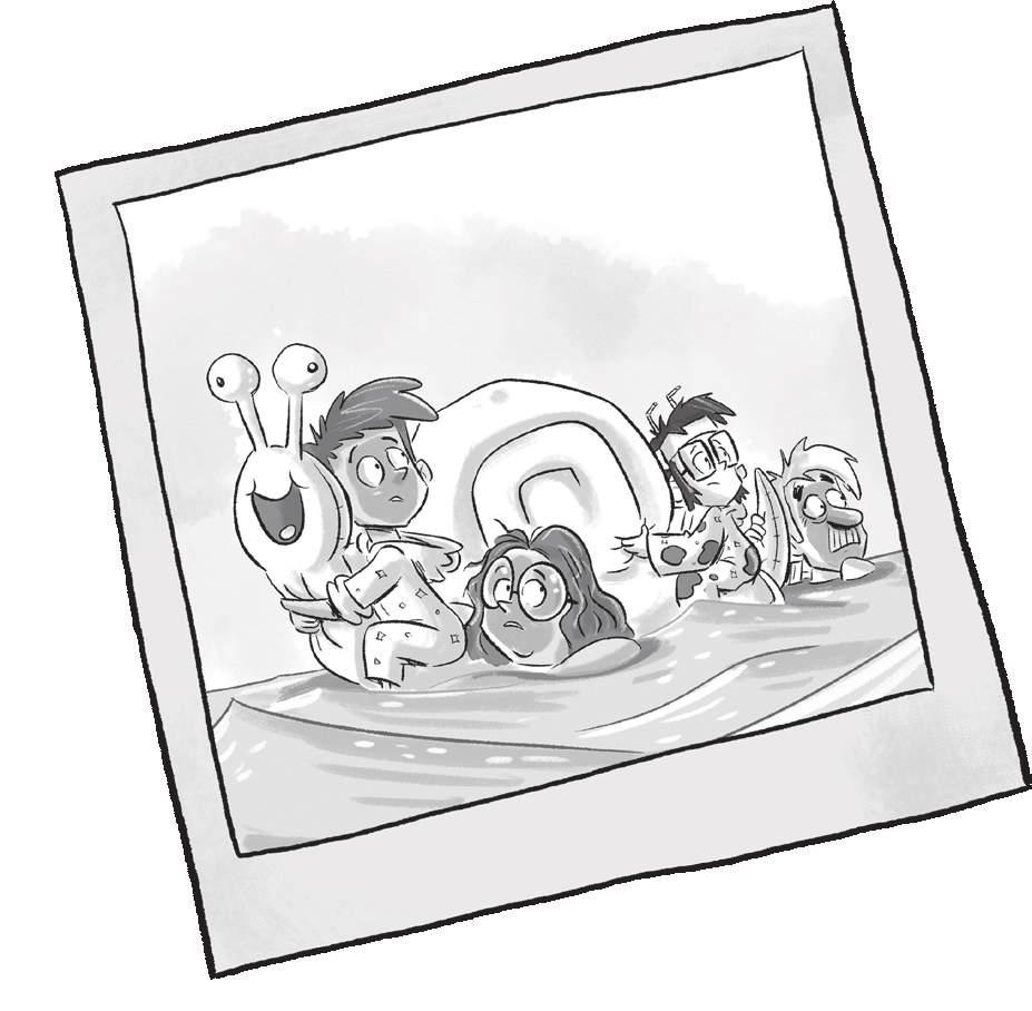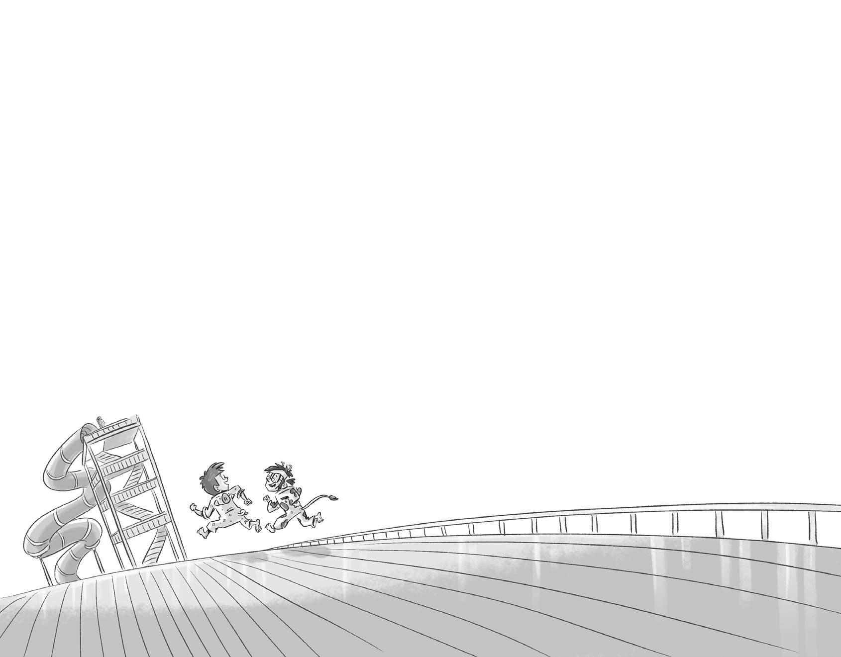 Pap en mam bleven achter, bakkend in de zon op het dek. Ze keken nog steeds met grote ogen om zich heen alsof ze het allemaal niet konden geloven. Er waren twee fantastische glijbanen: de ene – DE PYTHON – was een dichte, kronkelende buis. De andere – DE VELOCIRAPTOR