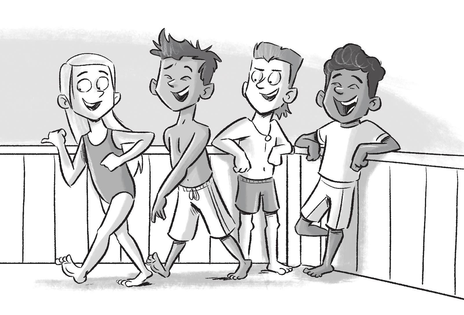 ‘Jullie mogen niet naar beneden,’ zei ze en ze duwde haar zonnebril weer omhoog. ‘Jullie moeten zwemkleding aan.’ Haar blik gleed over de GLITTERIGE