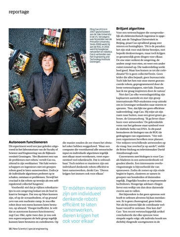 Autonoom functioneren Dit experiment werd een jaar geleden uitgevoerd in het laboratorium van de Faculty of Science and Engineering van de Rijksuniversiteit Groningen. ‘Het illustreert een van de problemen met robots,’ vertelt Cao nu, zittend in zijn werkkamer. ‘Het lukt wetenschappers en ingenieurs niet om groepen robots goed te laten samenwerken. Zodra je de individuele algoritmes probeert op te schalen, ontstaan er problemen. Terwijl het cruciaal is dat robots op termijn als een zelfregulerend collectief fungeren.’ Voorbeeld: stel dat je vijftien robotkarretjes in een omgeving loslaat om de boel in kaart te brengen. Dat zou op Mars kunnen zijn, of op de oceaanbodem, of op ground zero van een nucleaire ramp. Je zou elke robot door een mens kunnen laten besturen, op afstand. ‘Hoogst inefficiënt. Je wilt dat ze autonoom kunnen functioneren,’ zegt Cao. Oké, optie twee dan: je zou ook een supercomputer de hele groep tegelijk kunnen laten besturen en coördineren. Op 16 | New Scientist | special engineering