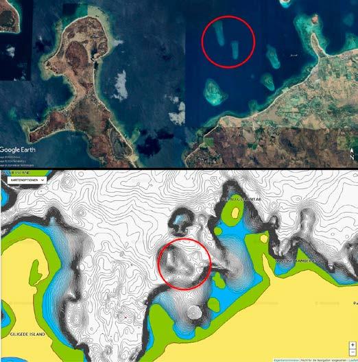 sjøkartet viser dybt vann kan man tydelig se revene på google earth.