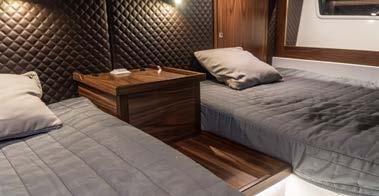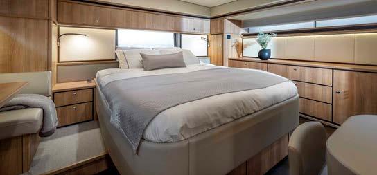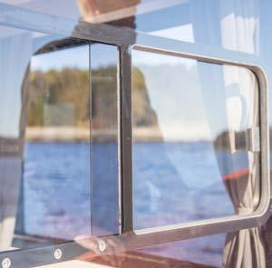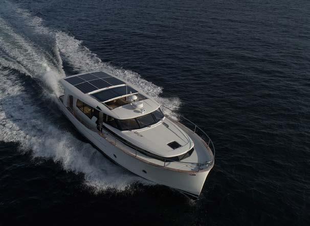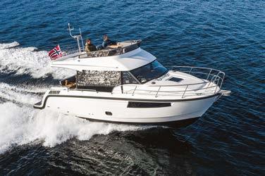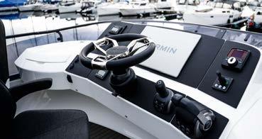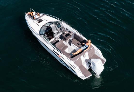 Panorama glasstak over salongen og elektrisk foldetak over det store akterdekket. Moderne og tidløst design, i kombinasjon med et stilrent og funksjonelt interiør. Sidedør og trygt nedsenket dollbord på styrbord side, understreker et gjennomgående fokus på brukervennlighet.