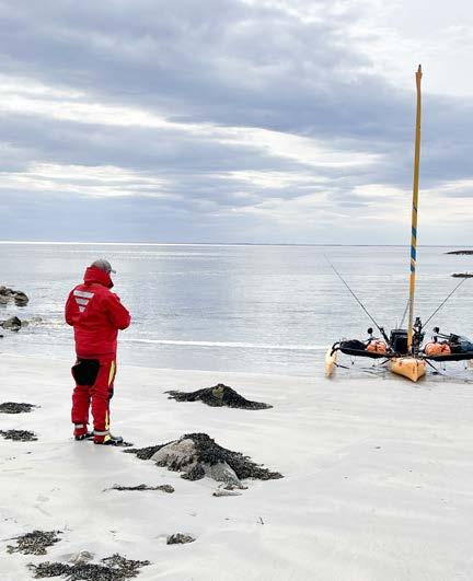 Raymarine Element på en rail. I tillegg har han med satellittkommunikasjon med nødpeilesender, flere powerbanks og kamerautstyr på turen. Og hvis han må søke nødhavn og det er stenbunn, har den erfarne eventyreren også med fire fendere som skal gjøre det lettere å dra kajakken skånsomt i land. Den veier tross alt over hundre kilo.