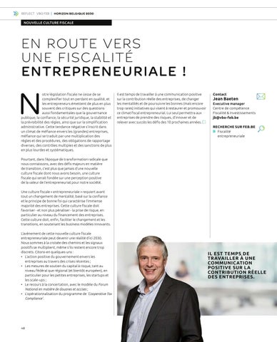 3RXUWDQW GDQV OoÄSRTXH GH WUDQVIRUPDWLRQ UDGLFDOH TXH QRXV FRQQDLVVRQV DYHF GHV GÄƬV PDMHXUV HQ PDWLÃUH de transition, c’est plus que jamais d’une nouvelle FXOWXUH ƬVFDOH GRQW QRXV DYRQV EHVRLQ XQH FXOWXUH ƬVFDOH TXL VHUDLW IRQGÄH VXU XQH SHUFHSWLRQ SRVLWLYH de la valeur de l’entrepreneuriat pour notre société. 8QH FXOWXUH ƬVFDOH HQWUHSUHQHXULDOH UHTXLHUW DYDQW WRXW XQ FKDQJHPHQW GH PHQWDOLWÄ EDVÄ VXU OD FRQƬDQFH et le principe de bonne foi qui caractérise l’immense PDMRULWÄ GHV HQWUHSULVHV &HWWH FXOWXUH ƬVFDOH GRLW favoriser - et non plus pénaliser - la prise de risque, en SDUWLFXOLHU DX QLYHDX GX ƬQDQFHPHQW GHV HQWUHSULVHV &HWWH FXOWXUH GRLW HQƬQ IDFLOLWHU OH FKDQJHPHQW HW OHV transitions, en soutenant les business modèles innovants. /oDYÃQHPHQW GH FHWWH QRXYHOOH FXOWXUH ƬVFDOH entrepreneuriale peut devenir une réalité d’ici 2030. Nous sommes à la croisée des chemins et les signaux positifs se multiplient, même s’ils restent encore trop discrets. Citons-en quelques-uns : • L’action positive du gouvernement envers les HQWUHSULVHV DX WUDYHUV GHV FULVHV UÄFHQWHV • Les mesures de soutien du capital à risque, tant au niveau fédéral que régional (et bientôt européen), en particulier pour les petites entreprises, les startups et OHV VFDOH XSV • Le recours à la concertation, avec le modèle du Forum National en matière de douanes et accises • L’opérationnalisation du programme de 'Cooperative Tax Compliance'.