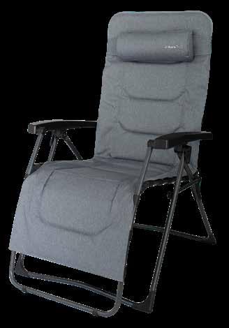 Nieuwe model campingstoel met uitschuifbaar hoofdkussen. De stof is van een ademend 3D-mesh met waterdoorlatend polyesterschuim Sneldrogend, comfortabel en gemakkelijk in onderhoud. Het nieuwe D-aluminium frame met epoxycoating laat zich eenvoudig inklappen tot handig formaat wat in bijna elke caravanbagageruimte of kast past. Het uittrekbare hoofdkussen vermindert de inklaphoogte met 13 cm. De stoel heeft een stevig aluminium scharnier en daardoor een max. draagvermogen van 140 kg. Rugleuning is 7x verstelbaar. Voetensteun optioneel leverbaar.