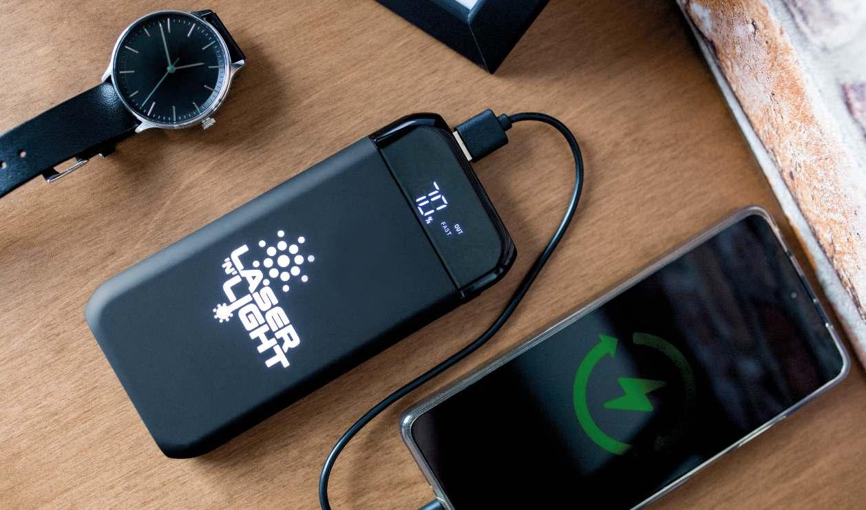Exclusive Collection Powerbank, wireless Ladegerät 5W-15W, funktioniert mit Geräten mit induktiver Ladefunktion, digitale Anzeige des Ladezustands, Hintergrundbeleuchtungseffekt nach Gravur, inklusive Tasche, verpackt in Geschenkbox